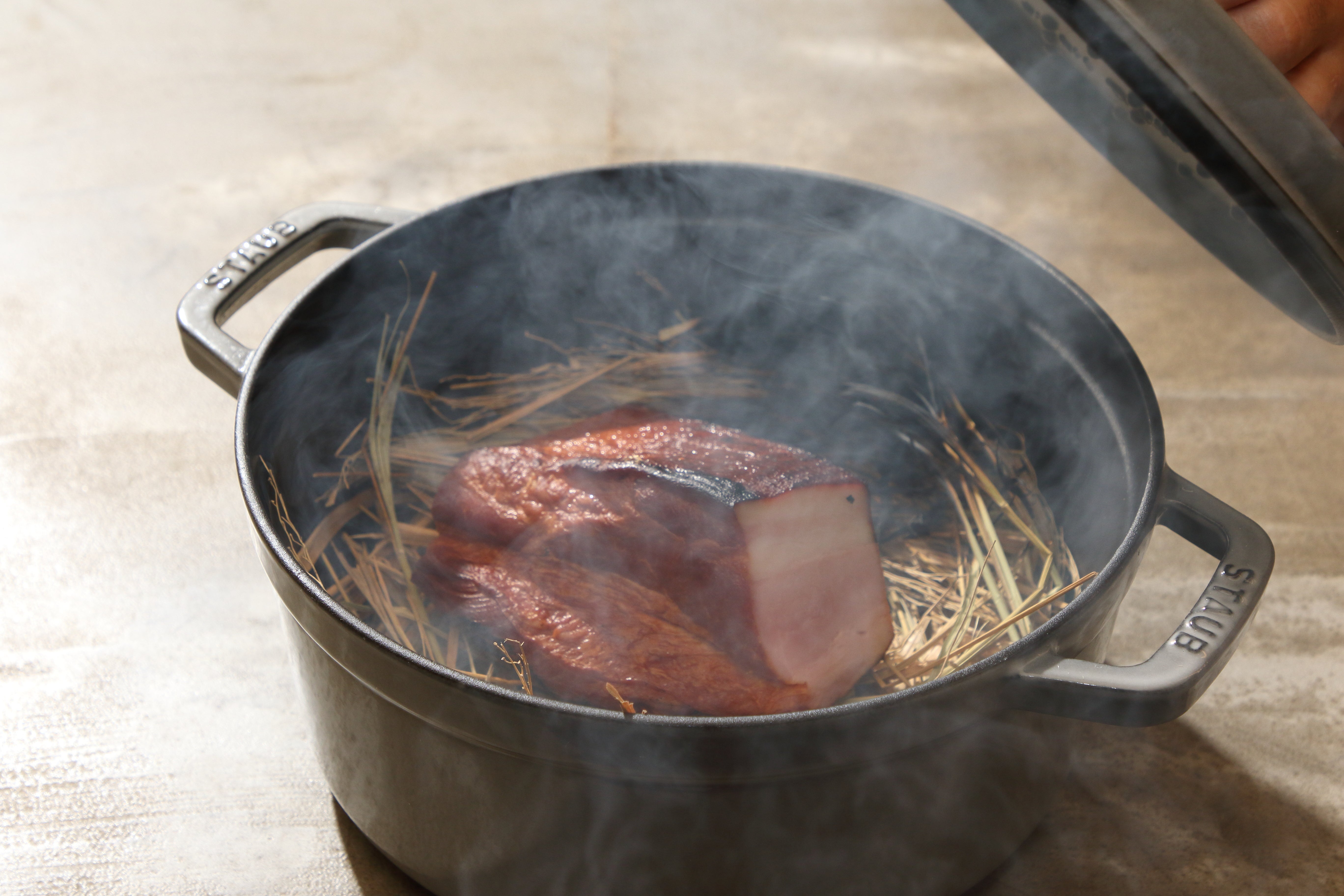 自家製ベーコンの追い藁燻製
