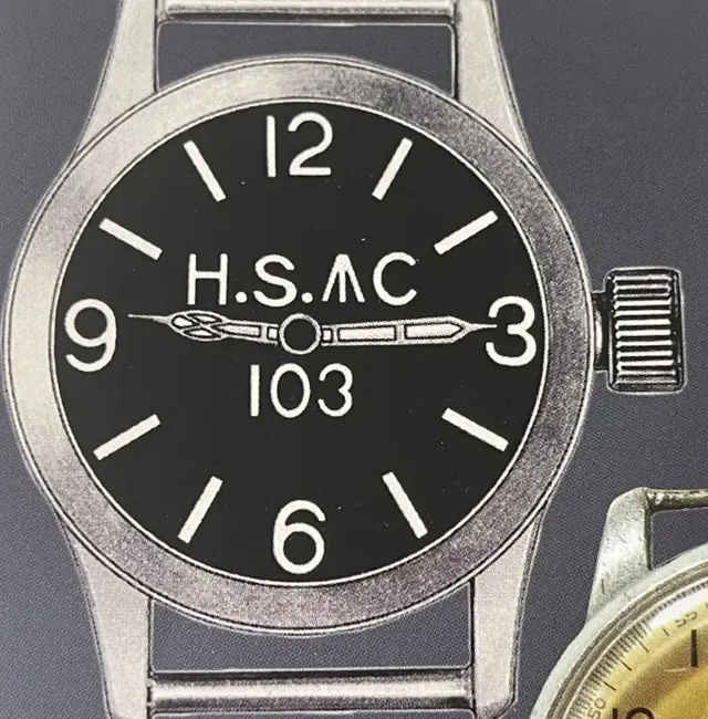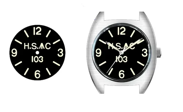 『H.S』はHydrogaphic Survery(水位測量)の略であります。その横には『↑』のブロードアローの印字があります。隣にはH.S.の後通常腕時計を表す『8』が記載されるのですが、ここには『C』と記載されています。『C』はメーカー記号と解釈されていましたが、1945年2月8日の696.-クロノメーターと時計 パターン番号の割り当て表には、腕時計、パターンH.S. C 「および 」A.T.P: "は、タウントンのクリーチバロウ・ハウスにある水文学者(Hydrographer)が特定の特別な業務のためにのみ供給しているため、上記のリストには含まれていない。との記載された文章が見つかりました。特殊業務目的に作成された文字盤のようです。6時上に書かれた『103』は海軍管理下のコードナンバーが記されています。なんとも記号化された文字版のロゴに深みを感じてしまいます。かなり希少な文字盤です。何か明確な目的があった事は確かなようです。この味わい深い文字版デザインが好きで前回 「Royal Army W-10 H.S. dial」を製作させていただきました。以降販売開始から約2年半、世界のミリタリーウォッチファンから人気を得てきた商品です。今回このデザインを色彩豊かによりファッショナブルに楽しめるようにデザインいたしました。