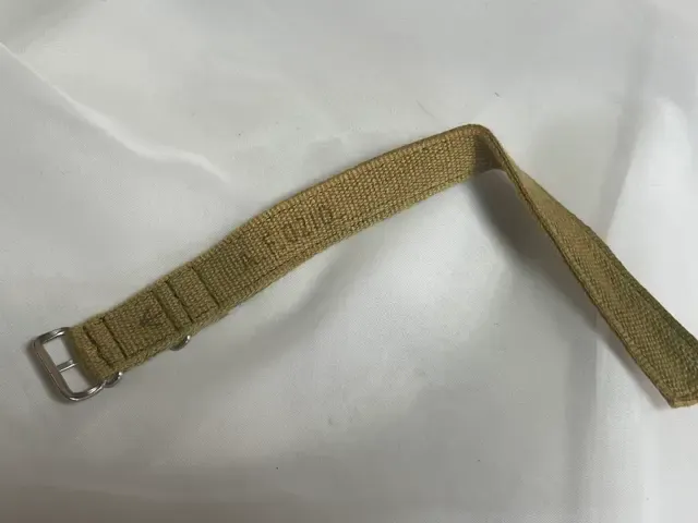 WWIIにイギリス軍が使用したコットン製ベルトの復刻です。なんとベルト穴のないベルトです。ちゃんと装着できます。色はカーキ(砂漠色)から薄グリーン。「A.F.0210」と印字されています。これは、軍が支給した装備品のうち、ウォッチストラップに与えられた管理番号です。空軍の6B/159や陸軍のW.W.W.(ダーティダース)等に装着して使用していました。腕まわりサイズ〜20cm※短めです。元々深緑の布地を、オリジナルに近づける為、一つづつ漂白剤にて色抜きを手作業でしております。個体差がありますのでご承知おきください。