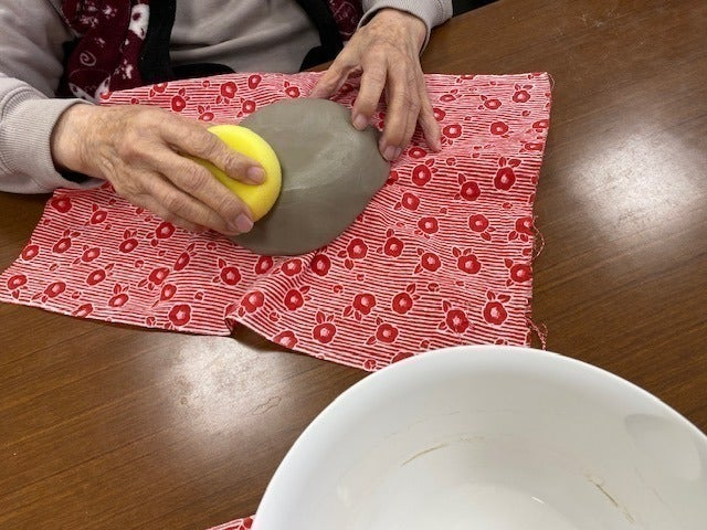 ある教室でのこと。80代くらいのおばあちゃんが「手が汚れちゃう」と言って最初は土に触れるのを嫌がっていましたが、まん丸の土を手のひらに乗せてあげると「冷たくて気持ちい」とにっこり。夢中になってお皿を作り、作業が終わるころには「見てみて!泥だらけ!」と満面の笑み。こんな顔をされたら講師冥利に尽きると実感した瞬間でした。このホームでは後に各自作ったお皿を使いビュッフェスタイルのパーティーを楽しんだそうです。認知症ゆえに日常では陶芸体験のことを忘れていても、自作の器を見るたびに「私上手よね、もっと作りたい!」という声が上がるそうです。
