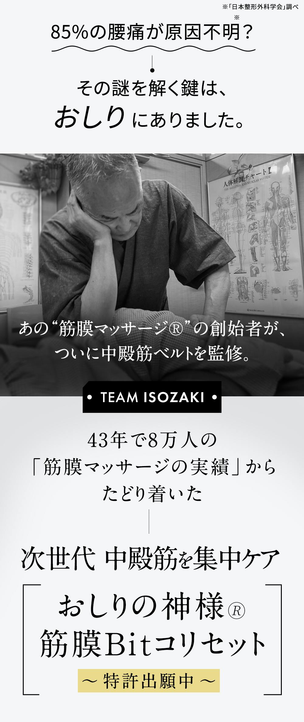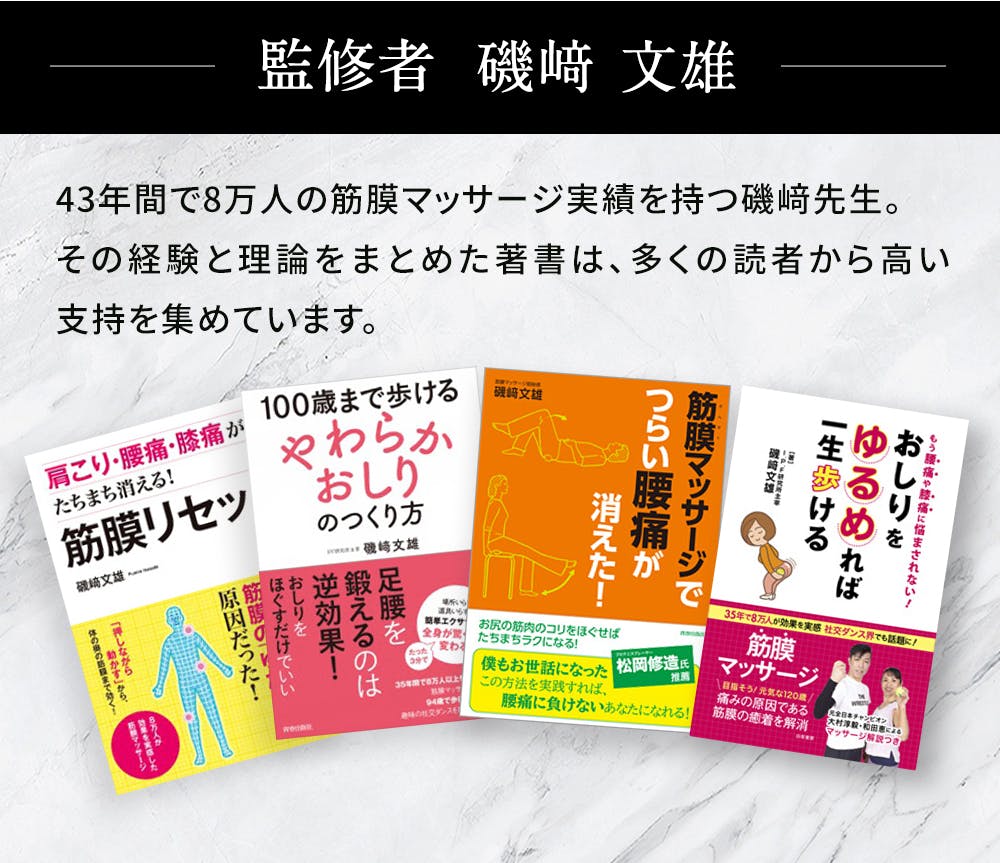 43年間の筋膜マッサージ®実績の中で磯﨑文雄先生がこだわり続けてきたのが「おしりの筋肉」です。中でも”中殿筋”に対して集中サポートできることを特徴として磯﨑先生監修のもとで商品開発しました。