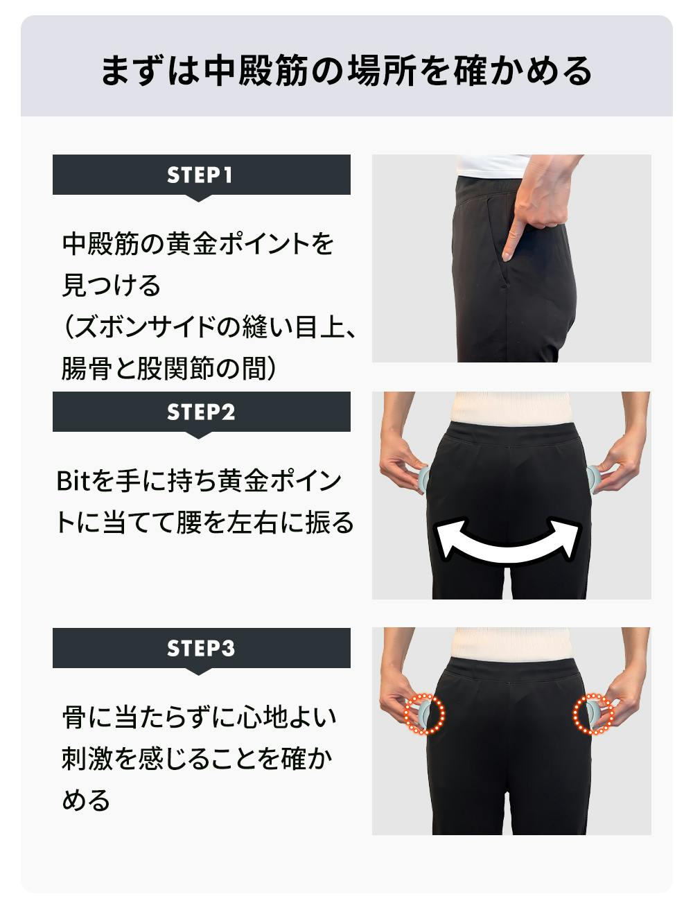 ⇒「筋膜Bitコリセット」は中殿筋の筋膜癒着ポイント2点を集中的にサポートすることで心地よさを実現、締め付けによる苦しさや内臓の圧迫感を軽減しています
