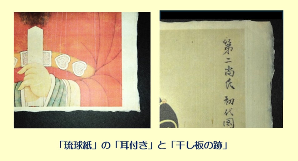 特に、手漉き琉球紙の特徴である「耳付き」と呼ばれる紙の四隅に残る柔らかで穏やかな輪郭と、琉球紙を乾燥させる際に紙の表面に刻まれる干し板の跡(木目)によって、「御後絵」が板絵として描かれていた時代を醸し出します。