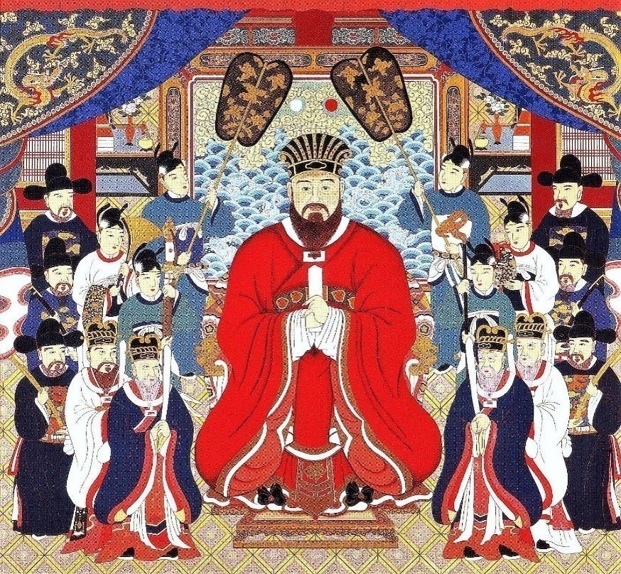 「御後絵」の特徴は、正面を向いた国王が中央でどっしり鎮座して、当時琉球の朝貢国だった中国様式の装束をまとっています。王様の周りには従者たちが小さく描かれていて、大きさの違いによって王様が偉大であることを表現しているようです。