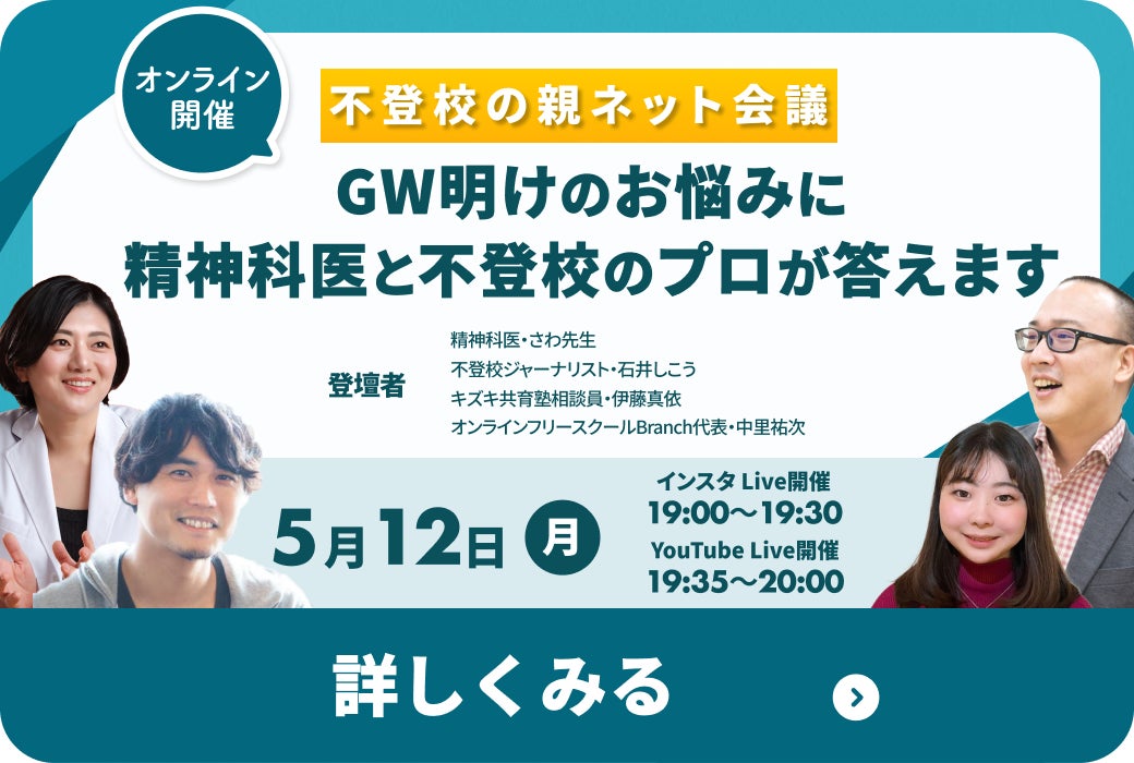 2025/05/12 17:00新学期から1か月経ちGWも明けたこの頃は、不登校に関するお悩みの相談をかなり多く受ける時期の1つです。不登校の親ネット運営メンバーは、そんなGW明けの保護者のお悩みに対して、質疑応答を行う無料のオンラインライブをInstagram &YouTubeで急遽、開催することとなりました!さらに今回、スペシャルゲストとして、YouTubeなどでご活躍されている【精神科医のさわ先生】にご参加いただきます!!皆様からの質問に、たくさん答えていこうと思います。ぜひご参加ください!【登壇者】さわ先生(精神科医。Instagram「親子の心をつなぐ精神科医さわ」、YouTube「精神科医さわの幸せの処方箋」)石井しこう(不登校ジャーナリスト。「石井しこう公式サイト」)伊藤真依(キズキ不登校相談員、「キズキ共育塾」名古屋校 元教室長)中里祐次(「オンラインコミュニティBranch」代表)【参加方法】特別なお申し込み不要でご参加いただけます。2025/5/12(月):19時〜19時30分さわ先生のInstagramアカウントにて実施します。>>親子の心をつなぐ精神科医さわ2025/5/12(月):19時35分〜20時キズキのYouTubeアカウントにて実施します。>>不登校・中退の方のゼロからの学び直しTV もっと見る
