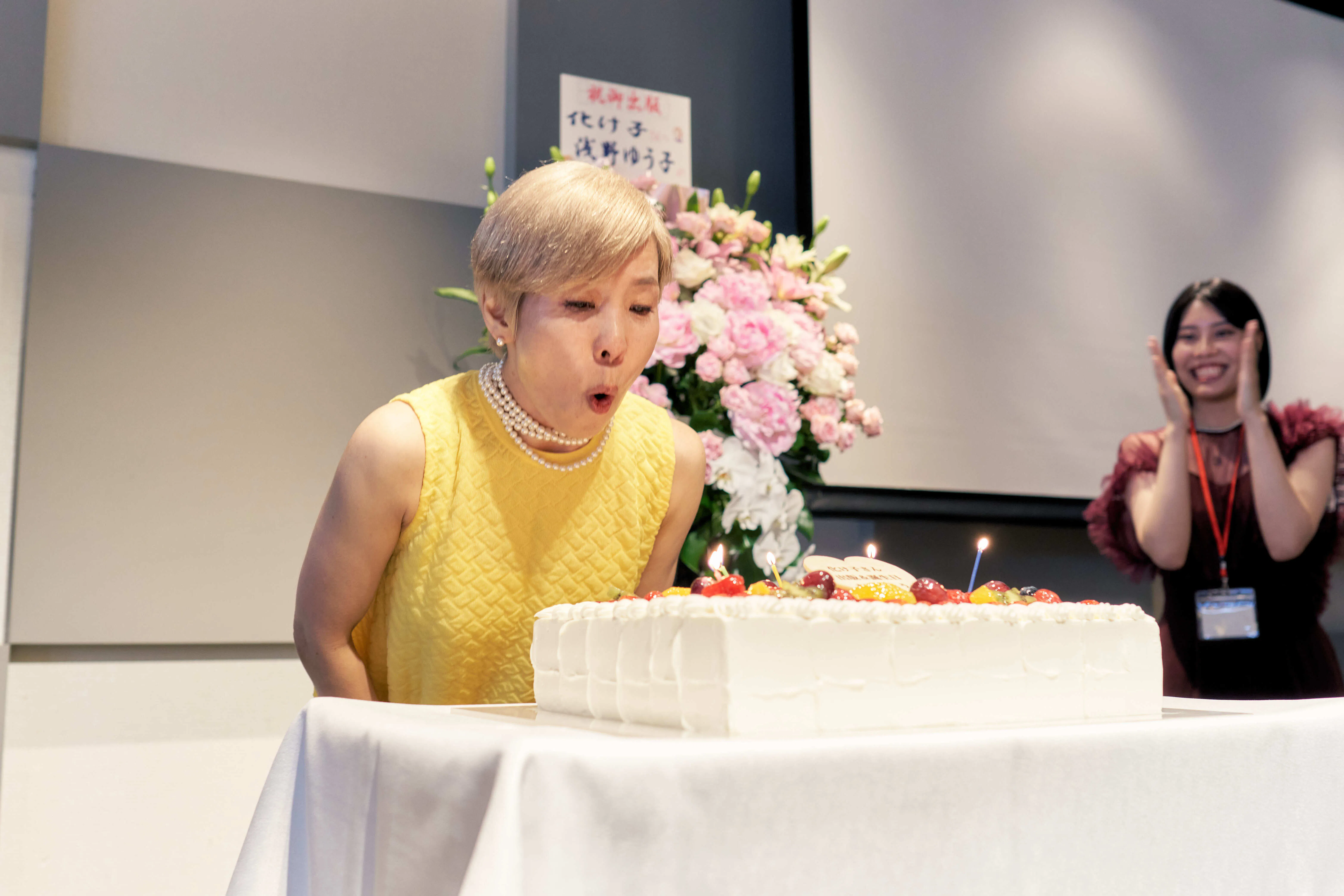 化け子チームは、化け子に内緒で「バースディケーキ」も頼んでおり、化け子の子供達二人からのお祝いの言葉も、これまた感動のメッセージ♪