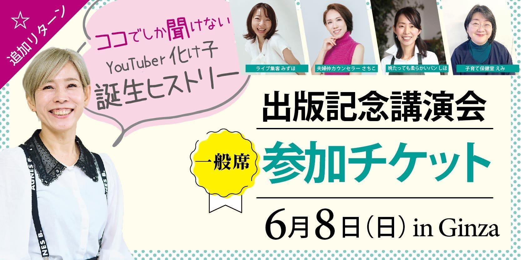 新リターン!一般席:出版記念講演会 8,888円 ※出版記念パーティーの参加権はつきません※ ココでしか聞けない、オフレコの話になること間違いなしヘアメイクのプロ化け子がなぜ起業塾へ通っているのかは皆さん、クラファンのヒストリーを読めばわかると思いますが!そこには表ではあまり語れない化け子誕生ヒストリー…そんな話を化け子から化け子チームのタカコ、サオリから、そして起業仲間の話を聞きませんか? ・6月8日(日)出版記念講演会の一般席(2列目以降)チケット ・書籍1冊(サイン入り)…会場で当日お渡し