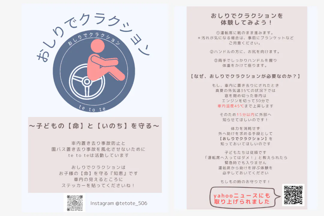 私たちは、車内置き去り事故から子どもたちを守るための活動を立ち上げました。福岡県で発生した園バスの置き去り事故をきっかけに、私たちにできることは何かと考え続けました。たまたまTVにて取り上げられていた、韓国で行われている「クラクションをお尻で押す訓練」を知り、『日本でも広めることができれば、子どもたちの命を守る手助けになるのではないか』という思いから、車内置き去り防止のステッカー配布活動を始めました。