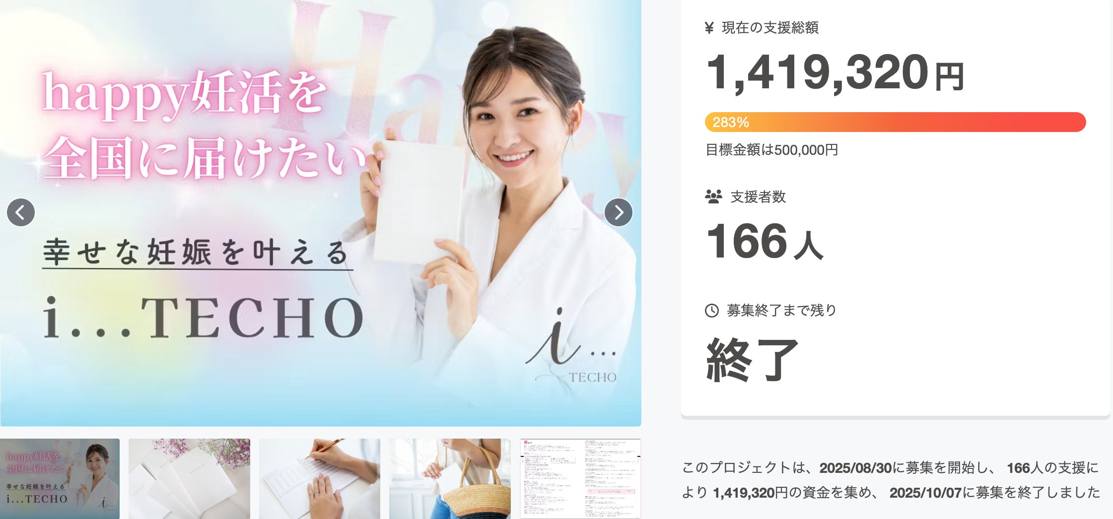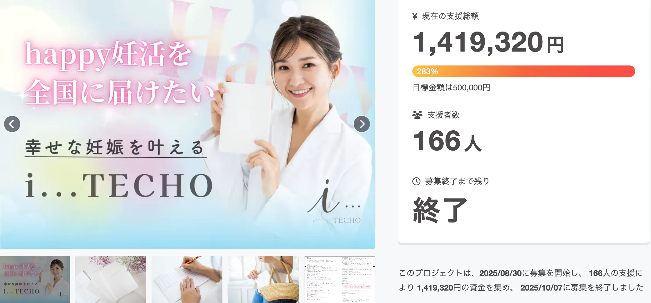 2025/10/08 08:00おはようございます。まなみです。8月30日からスタートした「happy妊活を全国に届けたい。幸せな妊娠を叶えるi...TECHO」のプロジェクトは、166名の方にご支援いただき、金額目標を283%達成する形で、無事に終了いたしました。ご支援くださいました皆様、応援してくださった皆様、本当にありがとうございました。これからいよいよ、i...TECHOが皆様の元へ旅立ちます。手に取ってくださった瞬間から、happyが増していきますように。今日から新たなスタートとして、妊活がhappyになるよう行動していきますので見守っていていただけますと幸いです。みなさんで、妊活始めたよ!=いいねえ!と言える社会に変えていきましょう。本当に本当に、いつもありがとうございます。 もっと見る