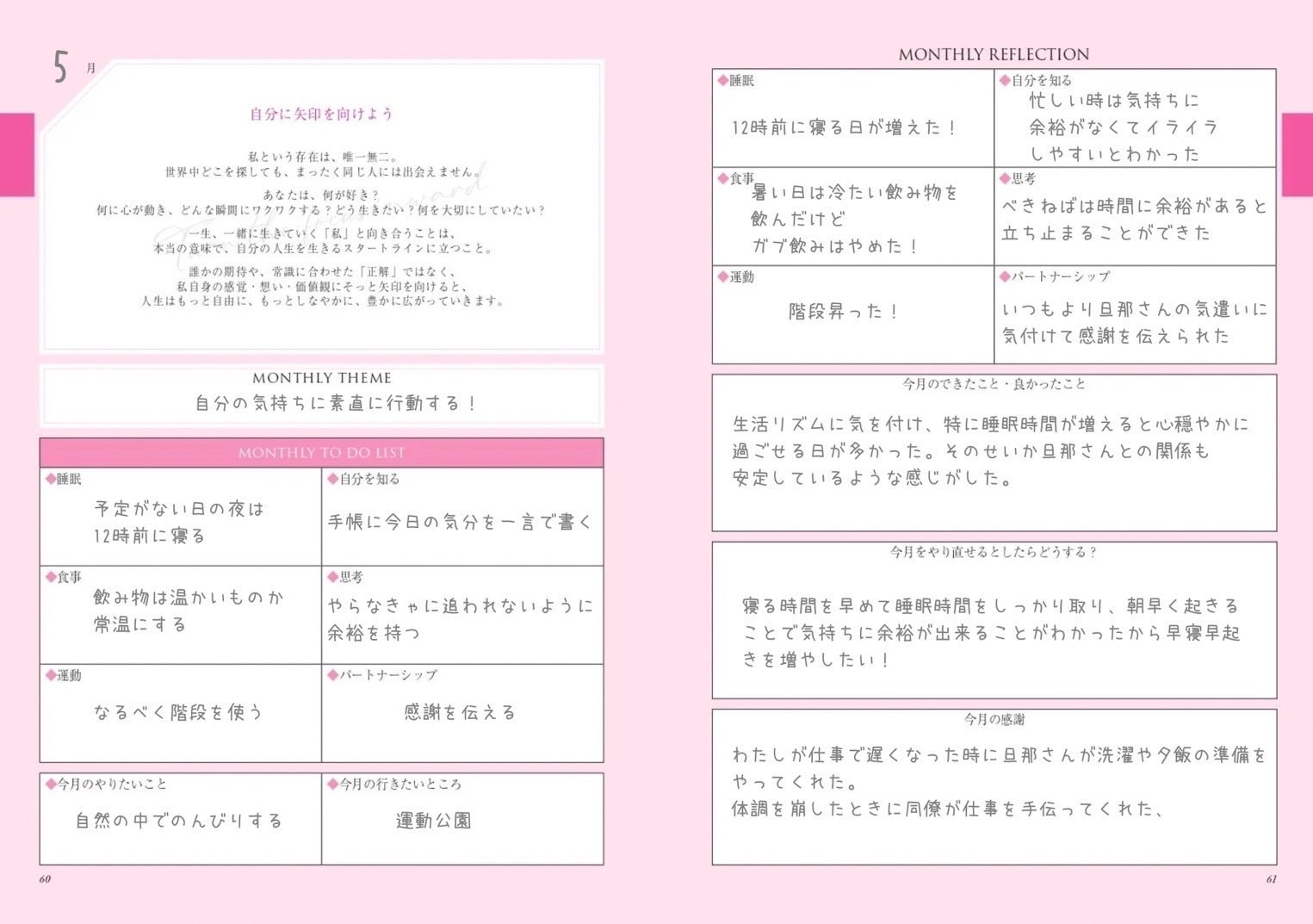 朝と夜、自然と手帳を開きたくなる構成で、楽しみながら習慣を変えていけます。