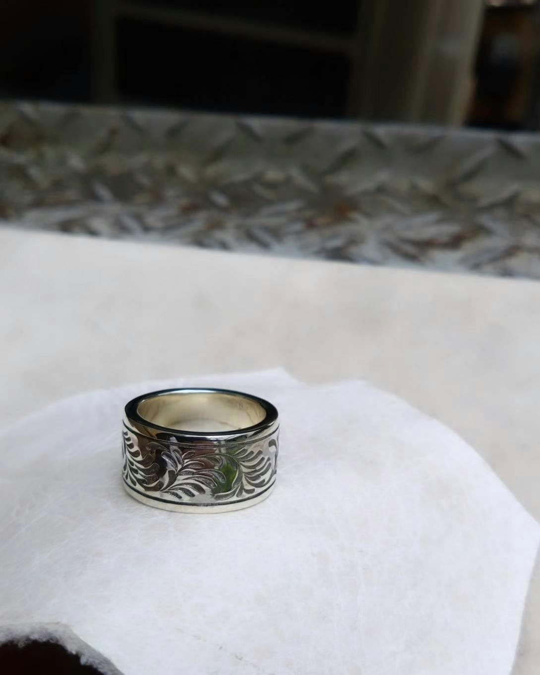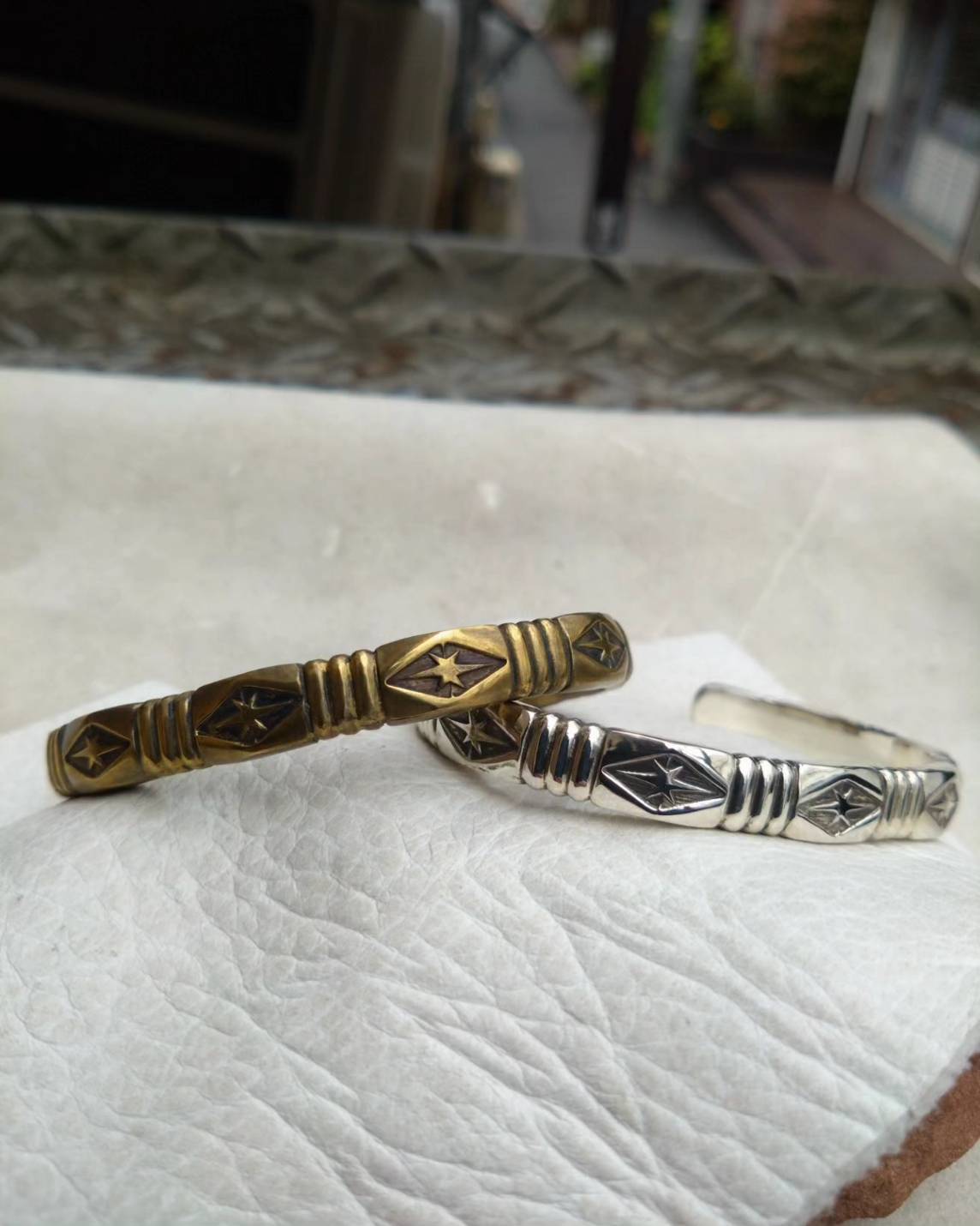 幅の広い唐草柄のリングを始めフェザーの組み合わせや糸ノコとヤスリで仕上げていくスリ出しバングル(真鍮素材のモノ)になります☆