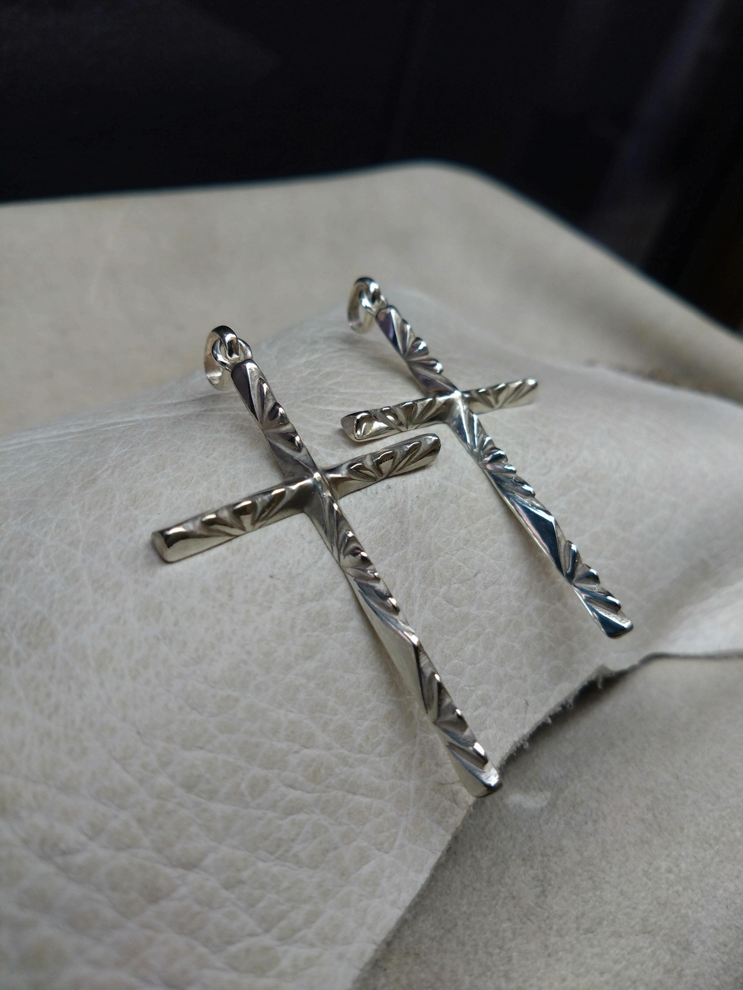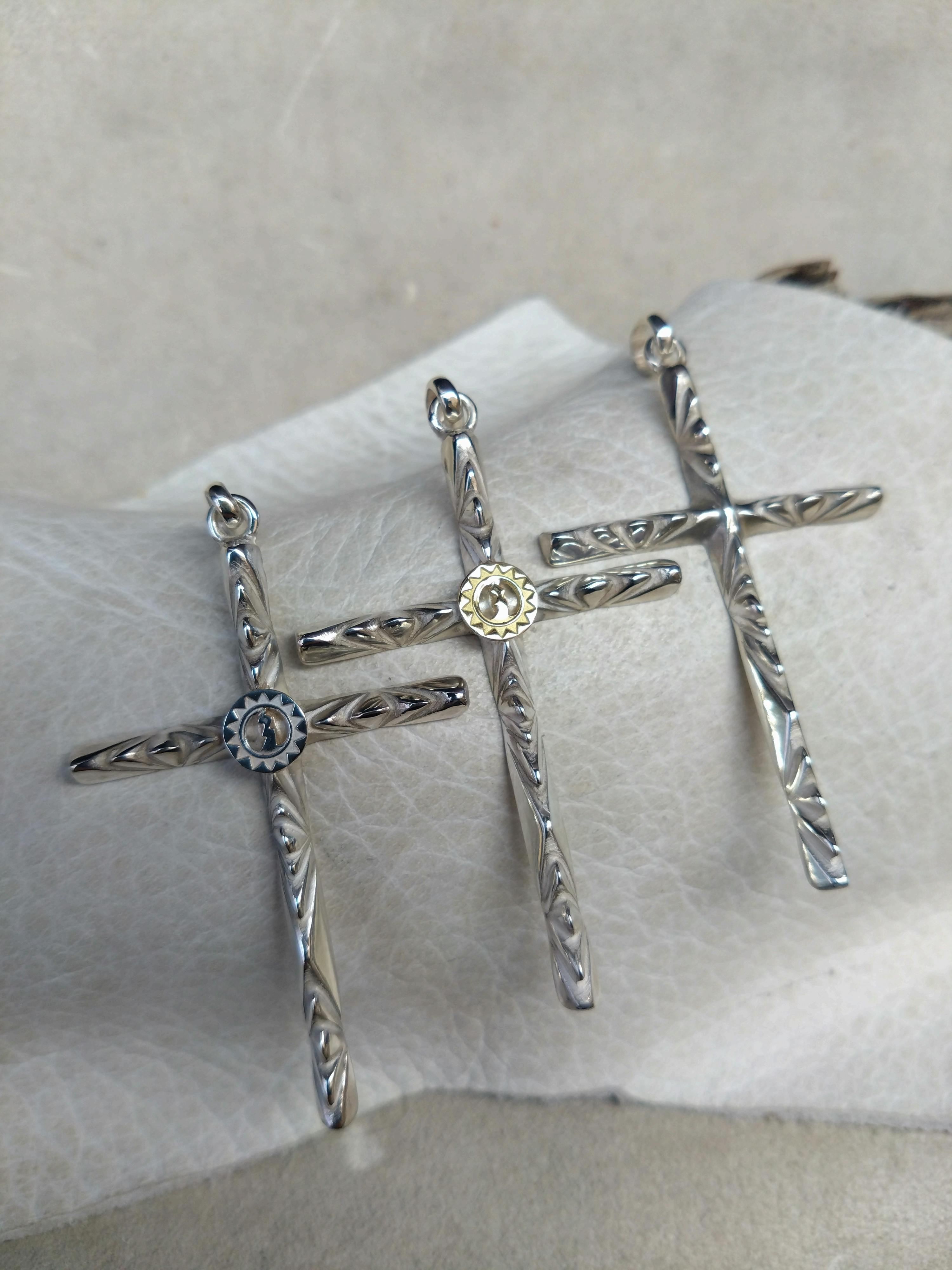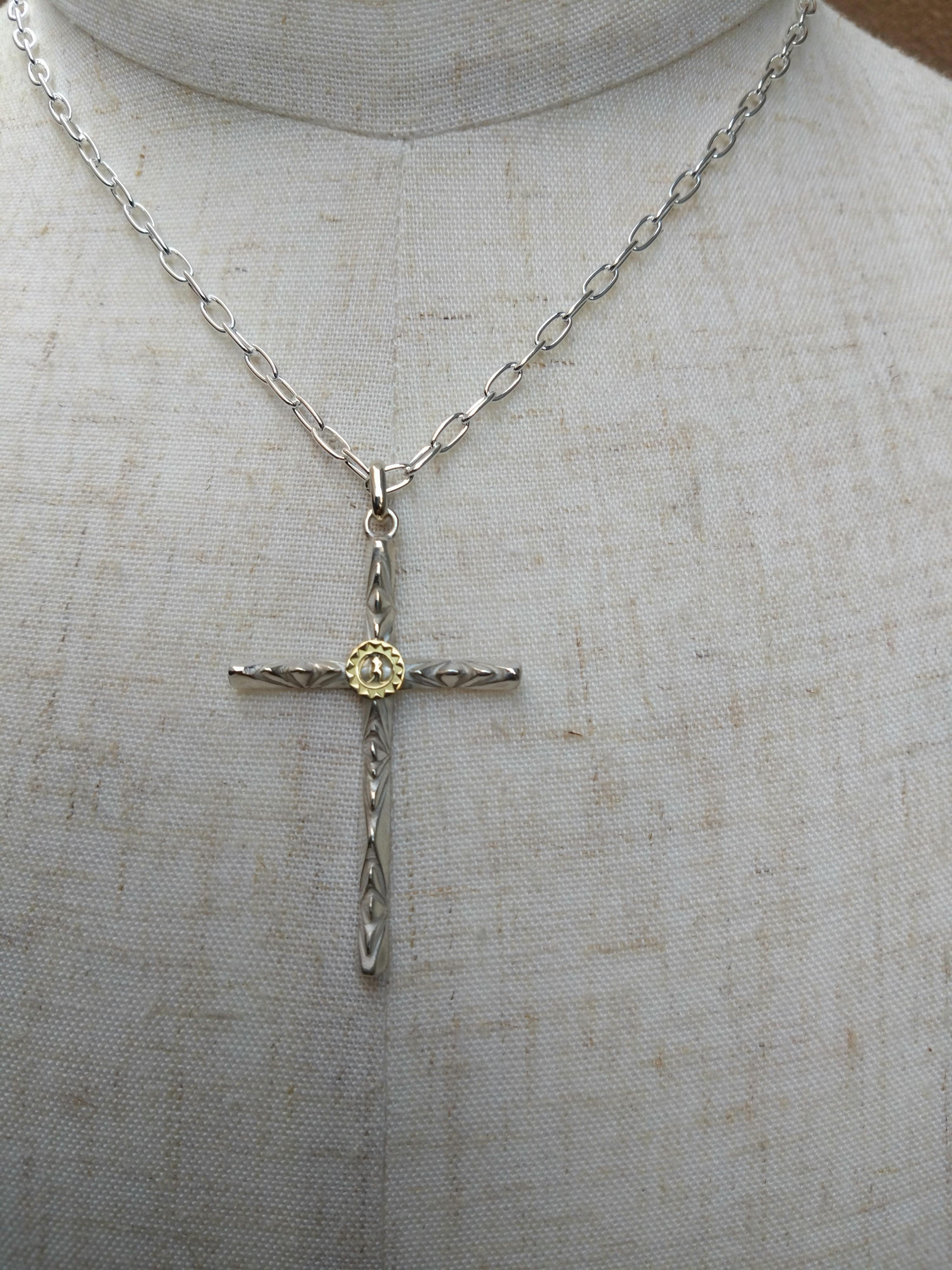 ベースに糸ノコとヤスリで擦り出してデザインしたクロスペンダントになります☆
