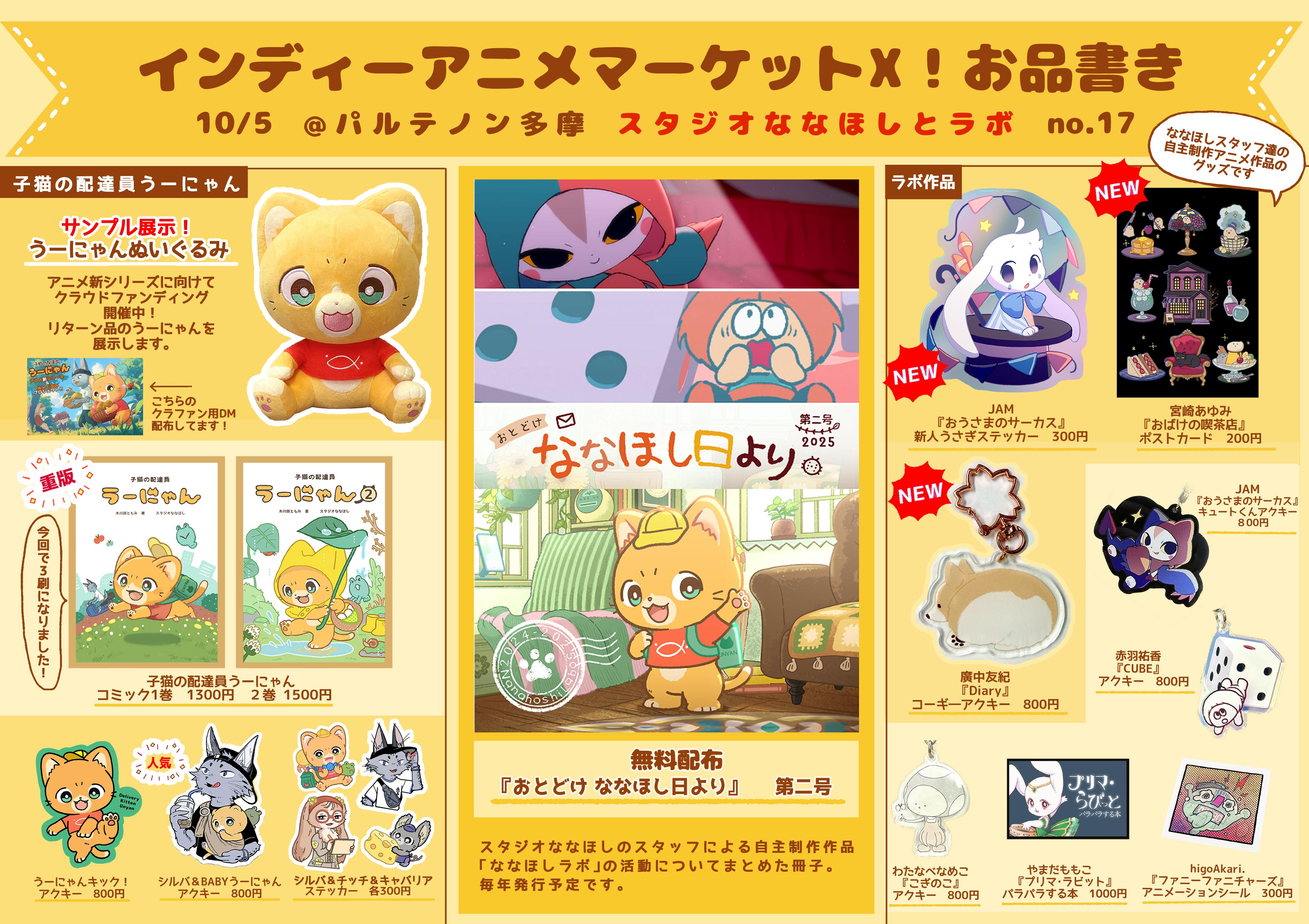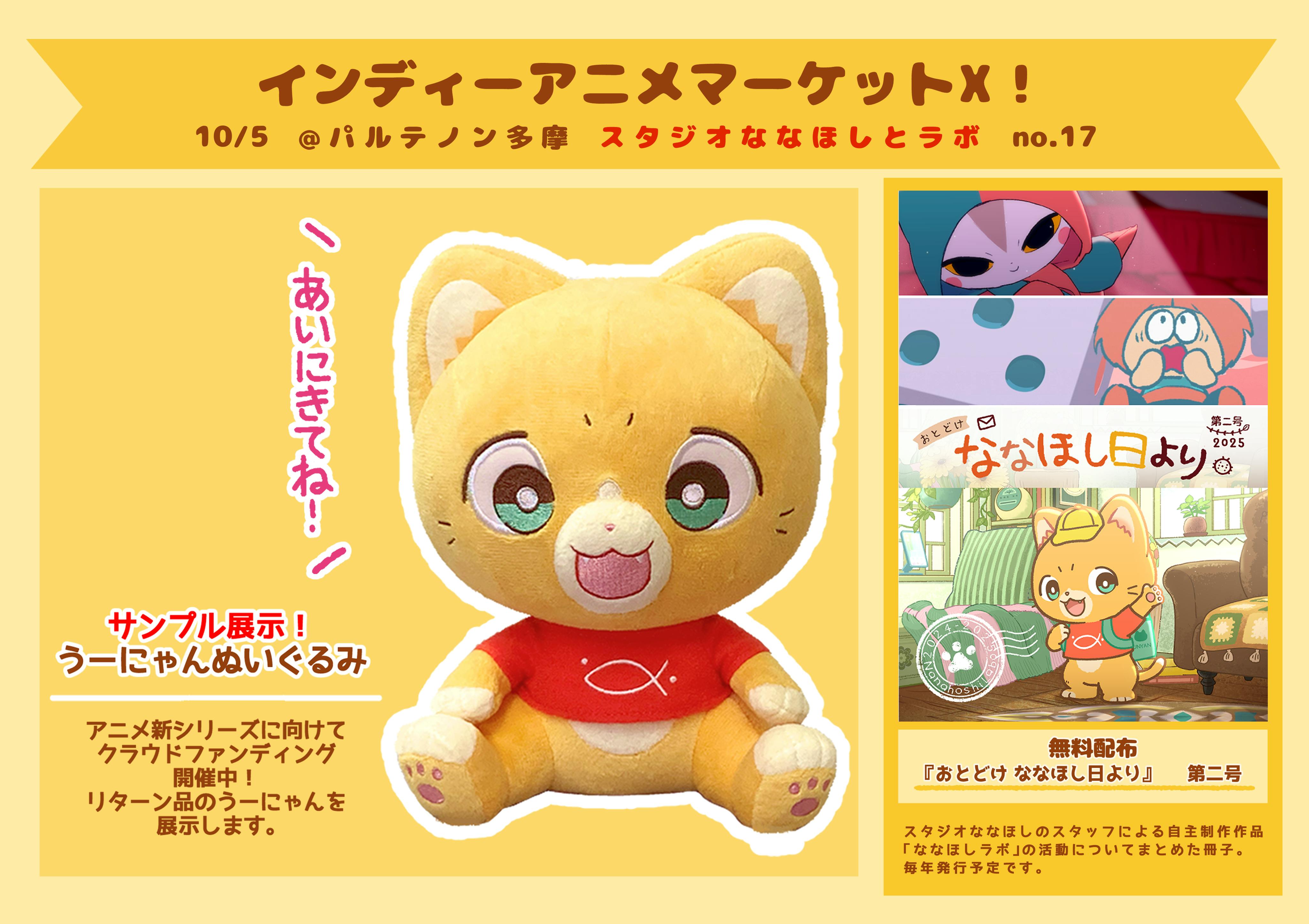 うーにゃん以外にも、『ななほし日より 第二号』(スタジオななほしスタッフによる自主制作作品の紹介冊子)の無料配布と、グッズも販売しています。