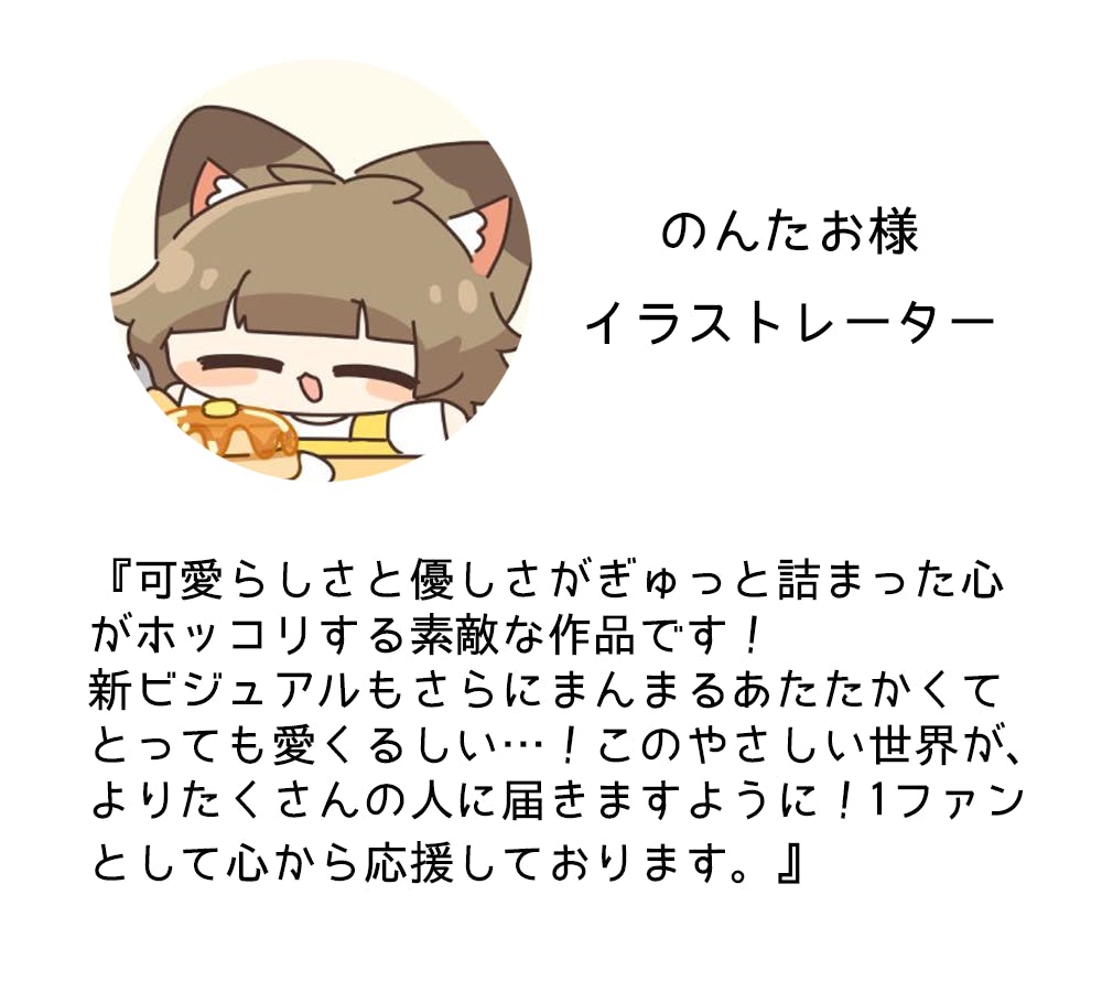 あたたかい応援メッセージ、本当にありがとうございます!これからも、まんまるでやさしい世界を大切にしながら、もっと多くの方に届くよう頑張ってまいります。のんたおさんの漫画は、どの子もちっちゃくて、ゆるくて、ちょっとずれてて最高にかわいい。まるで心に小さな友達ができたみたいで嬉しくなります!そして、のんたおさんが、なんとうーにゃんとシルバとカルパのイラストを…!! かわいすぎて尊すぎて…本当にありがとうございます。ずっと見ていたくなります!