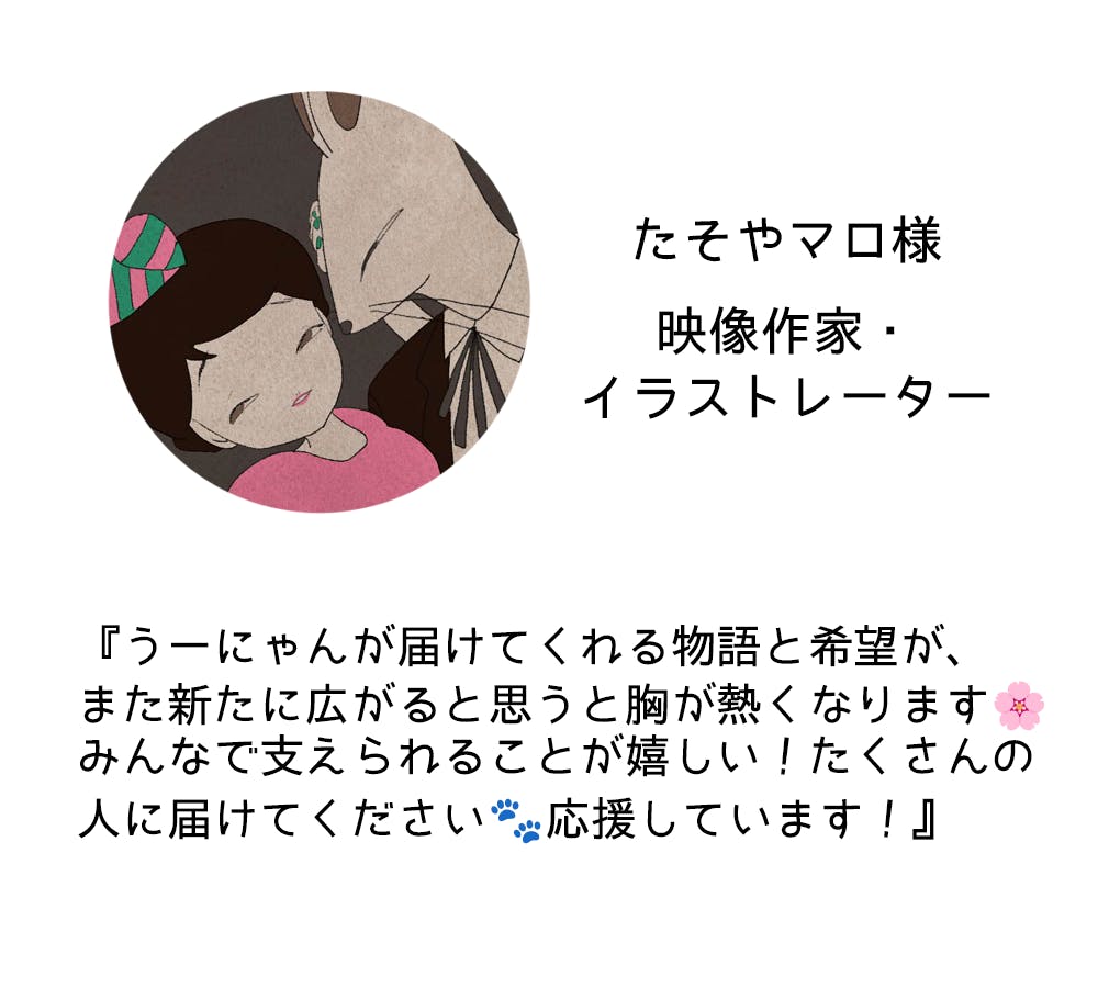 応援メッセージいただきましてありがとうございます!うーにゃんの小さな足取りが、たそやマロさんの言葉でまた一歩、前に進んだように感じました。ご期待に応えられるよう、心を込めて制作を続けてまいります。たそやマロさんの映像作品は、ちょっと不思議で詩的で独特なアニメーションが癖になります!見ていると自分の中の記憶がそっと揺れ動くような気がします。