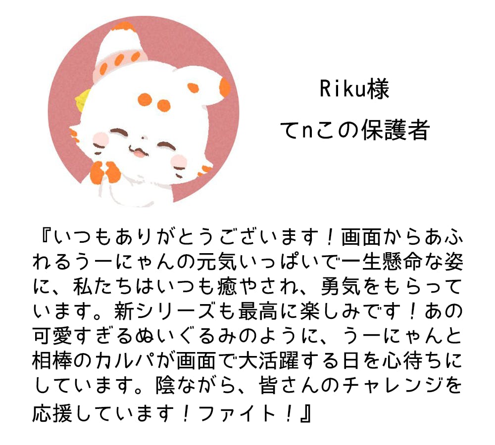 温かいメッセージをありがとうございます!うーにゃんのがんばる姿を、いつもあたたかく見守っていただけて嬉しいです。画面の中でもいきいきと活躍できるよう、チームみんなで心を込めてがんばります!また、てnこちゃんとぽnきちくんにも、いつも元気をもらっています!ふたりのやり取りには優しさとユーモアがあふれていて、私たちの制作の励みにもなっています…!