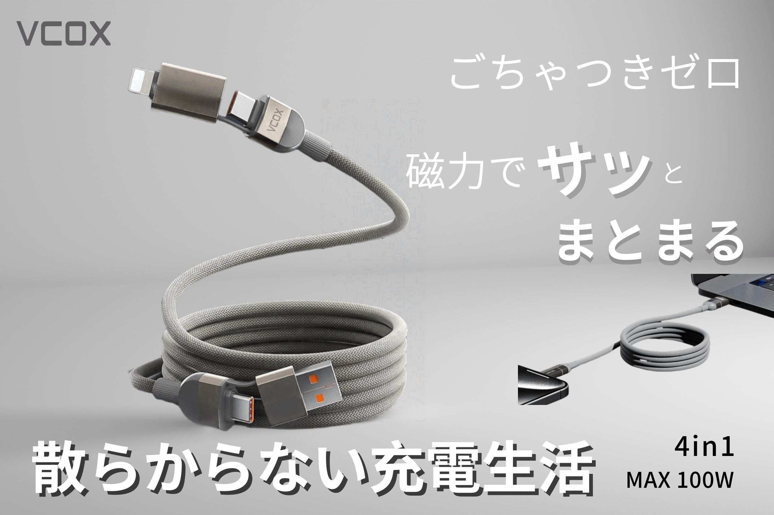 様々なデバイスに必要不可欠な充電ケーブル、不便だと思うことはありませんか?・端末に合わせて複数のケーブルが必要・ケーブルが絡まりやすい・コンセント周りがごちゃごちゃする・長いと邪魔、短いと不便・断線しやすいそんな不便を解決するのは「VCOX GADGET の4in1マグネット式マルチ充電ケーブル」です。