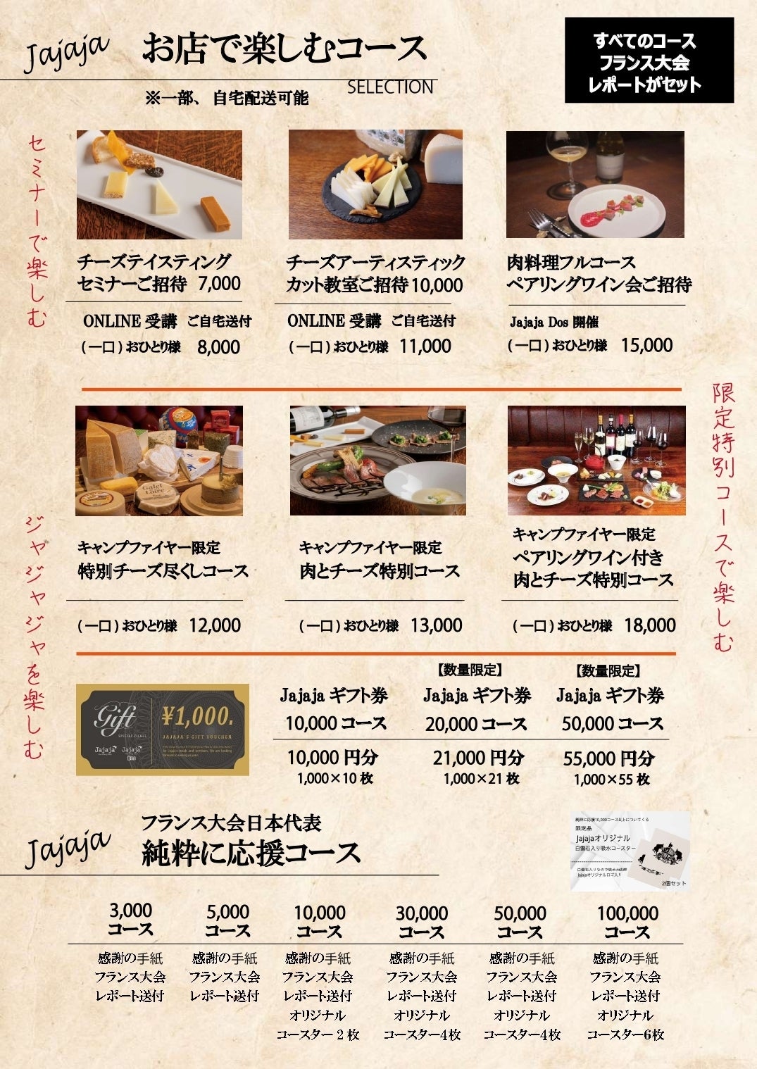 実際に「じゃじゃじゃ」とは発音しませんが、当店ではあえて「じゃじゃじゃ」と発音します。食事を楽しむ!そんな当たり前のことを追い求めてみたい。食で日本を明るく楽しくしたい!という想いで、このお店を2018年に夫婦2人で始めました。