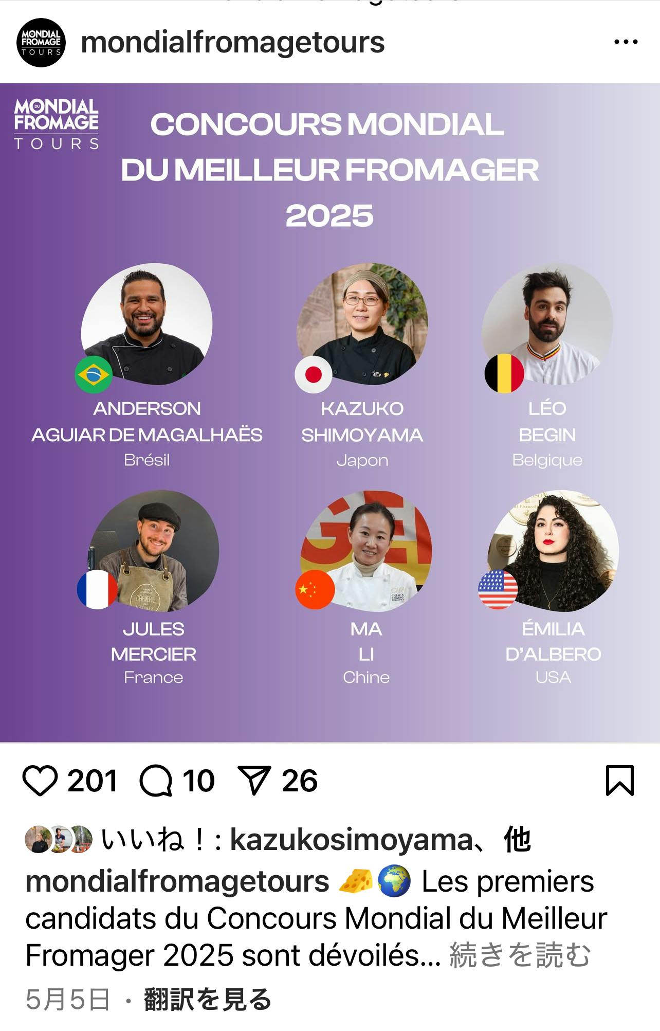 フランス大会2025全出場者発表今年はなんと!15カ国19名の出場で過去最多です!昨年度からの出場者自国のチーズアート優勝者自分でチーズ工房を経営しているような人などなどまさに世界の頂点を競うにふさわしい強者だらけです!発表後、Jajajaや私のインスタをフォローする他国の出場者がいたりして早くも情報戦が始まってますもうあとは頑張るしかない!!クラファンも残り2週間を切りました。大変多くの人々にご支援をいただきありがたい限りです。しかし!!まだまだ、目標には程遠い状況です...引き続きのご支援と拡散のご協力を是非是非よろしくお願いいたします