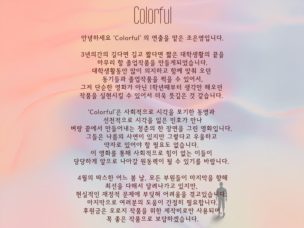 短編映画 『Colorful』 は、日韓の学生(韓国人学生+日本人留学生2名)が協力して制作する卒業制作であり、