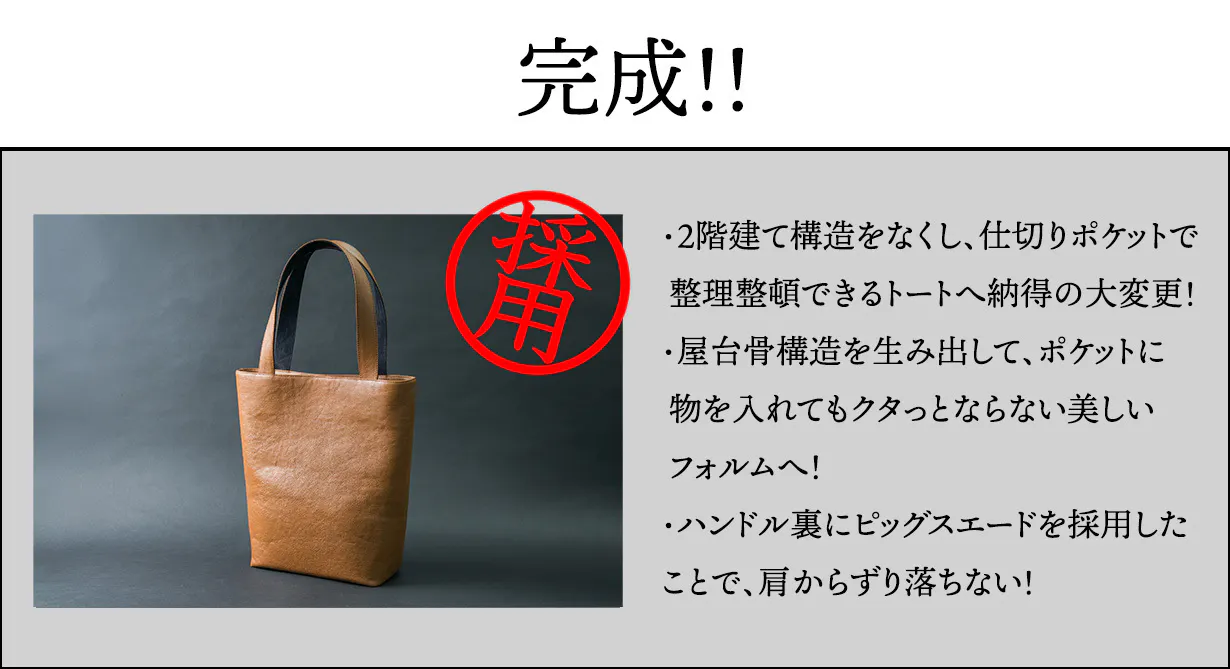 サンプル製作時に、スタッフから「ポケットにモノをたくさん入れると、バッグの下の方がグニャっとなって見た目が良くない」と指摘を受けて、生まれたのが「屋台骨構造」です。見事にモノを入れても倒れないバッグが完成しました!!
