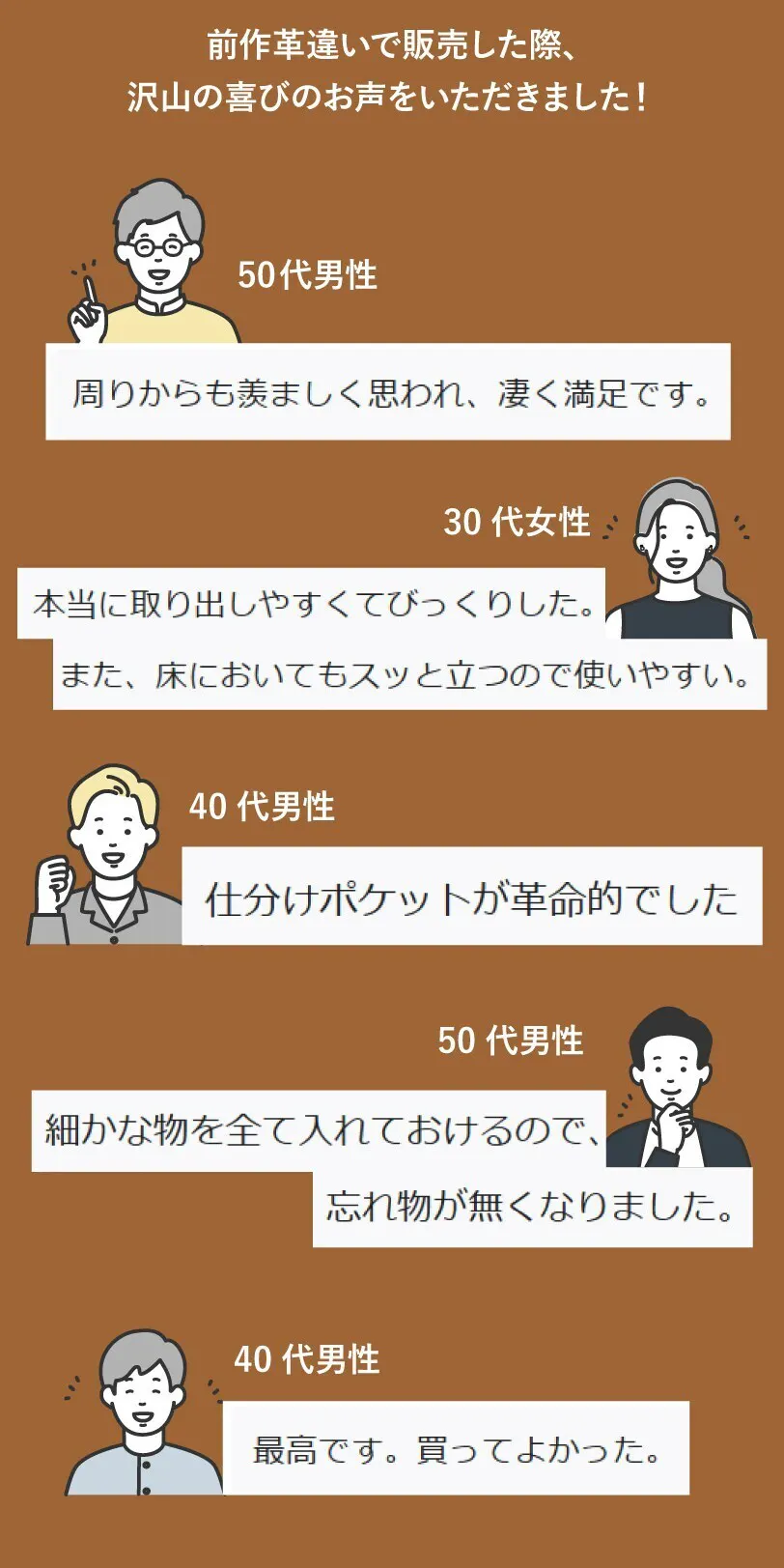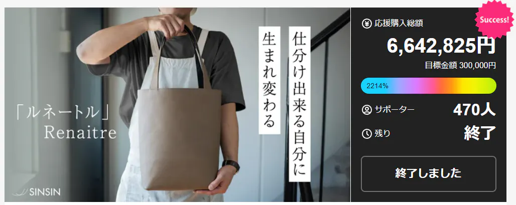 2025/05/31 18:00皆さま、こんにちは!新進工房の仙入寛章です。まずは「ルネートルマテーラ」にご支援してくださった皆さま、本当にありがとうございます!この文章を書いている時点で、、、・サポーター 110人・支援総額3,293,270円!とても嬉しいです!そして多くの皆さまから「使うのが楽しみ!」というお声をいただき、本当に励みになりました! また、販売開始から温かいコメントをいただき、心より感謝しています。一部をご紹介させてください!「父の日にぴったりなプレゼントを見つけて大変嬉しいです。楽しみに待っています。よろしくお願いします!ますます魅力的な紳士用バック、頑張ってください。」「理念が素敵だなぁといつも楽しく眺めておりましたが、これには一目惚れして支援ボタンを押してしまいました。楽しみにしています。」「質も良くて便利そうで気に入りました♡キャメルでお願いします皆さまの期待を超えるものづくりをお届けするのがプロとしての使命です。一生懸命、心を込めてお作りいたしますので、到着まで楽しみにお待ちください!」そして、応援してくださったすべての皆さま、販売をサポートしてくださったCAMPFIREスタッフの皆さま、本当にありがとうございます!皆さまのおかげでこの日を迎えることができました!感謝!!!!新進工房 兄 仙入寛章*********************▼『仕分けトートバッグ「ルネートル」』のプロジェクトページはこちら▼新進工房Youtubeにて作品情報や製作する職人の想いを発信しております。動画視聴はこちらお問い合わせ先:新進工房 カスタマーサービス電話:072-968-8181受付時間:平日 9:00 - 17:00 もっと見る
