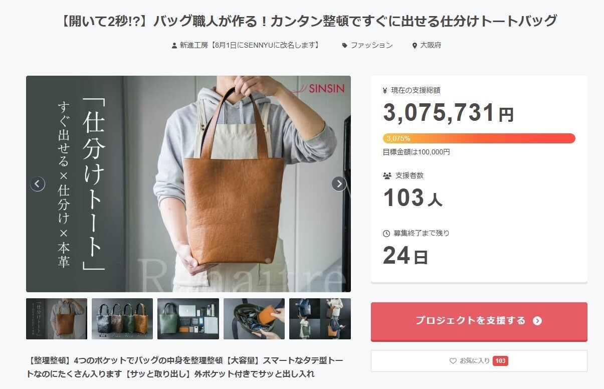 『【開いて2秒!?】バッグ職人が作る!カンタン整頓ですぐに出せる仕分けトートバッグ』プロジェクトにたくさんのご支援をいただき、誠にありがとうございます!