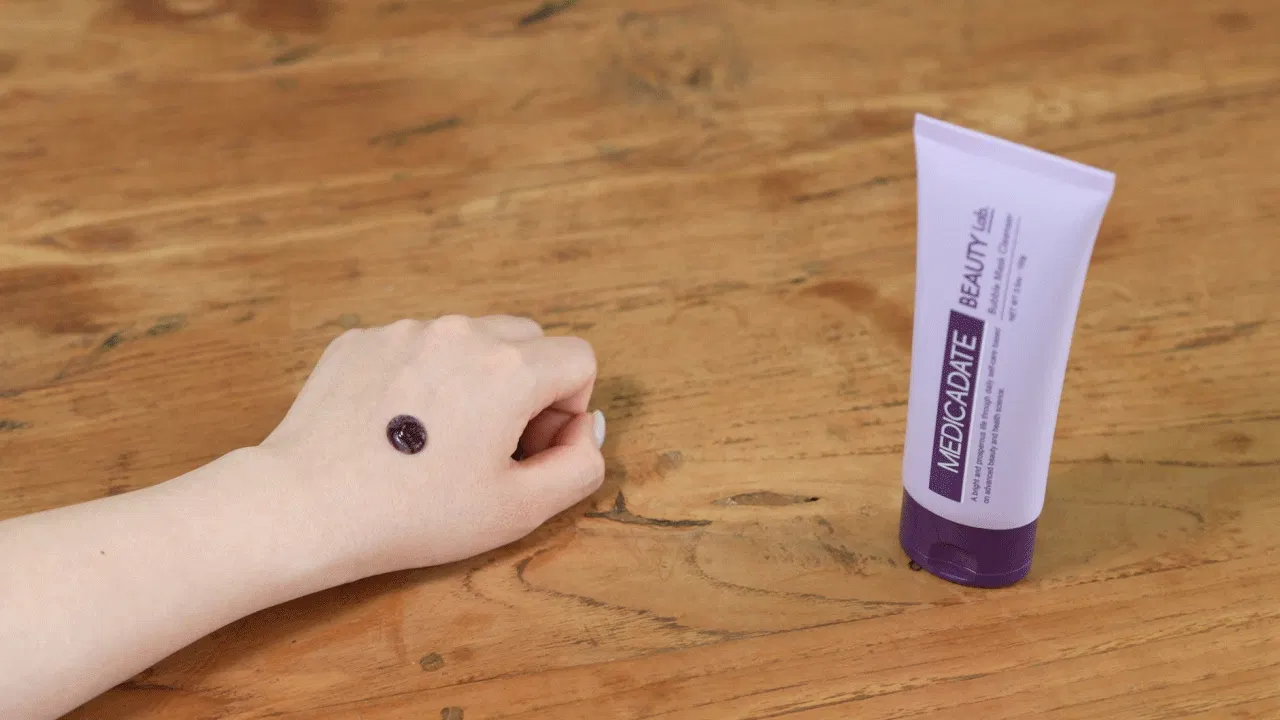 肌にやさしくなじませていただければ自己発泡機能で藤色の泡が現れます。