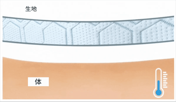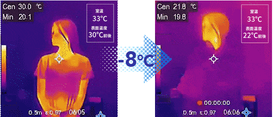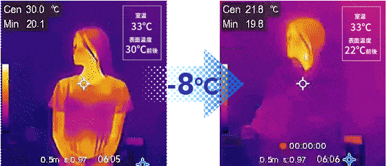 生地の表面温度は常に一定の21℃~22度。周りの暑さに影響されることなく冷たい触感が続きます。