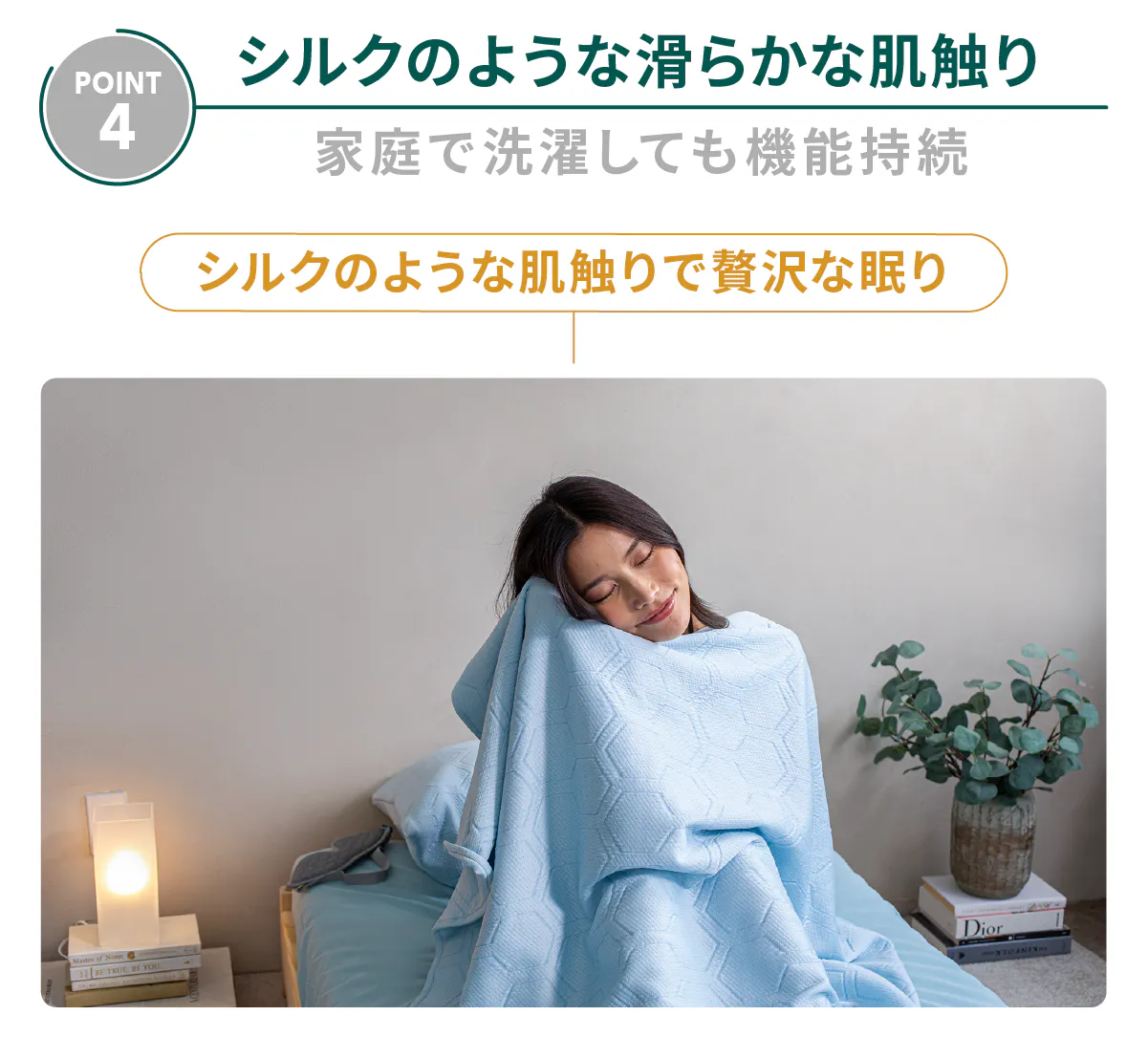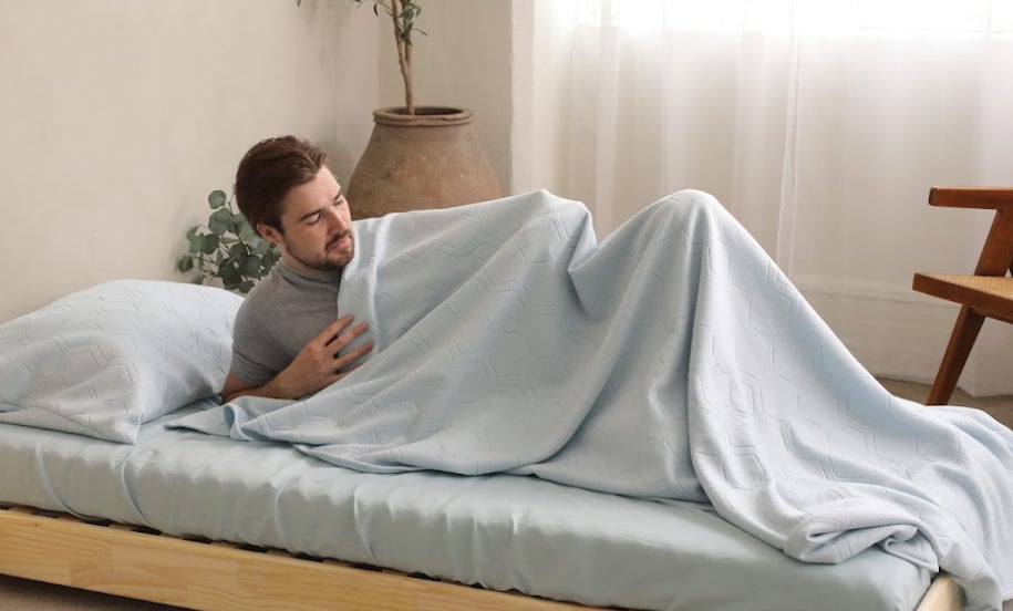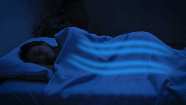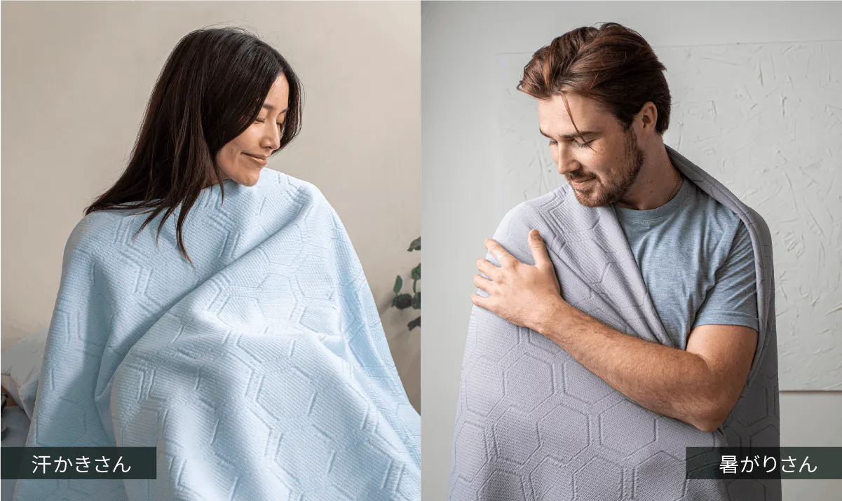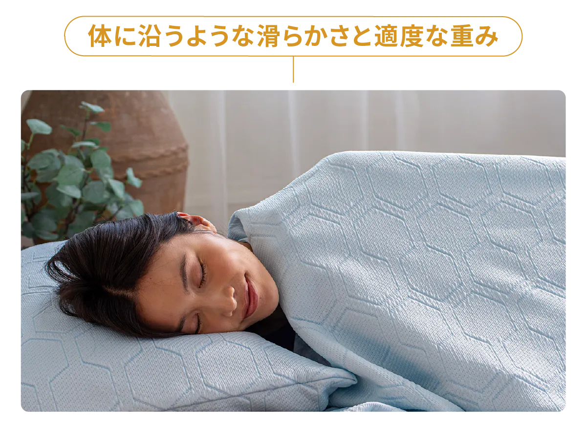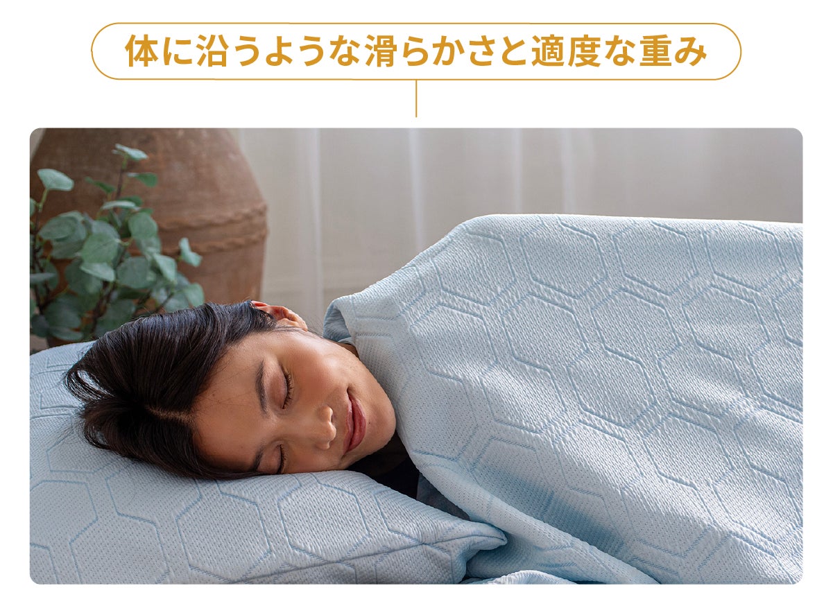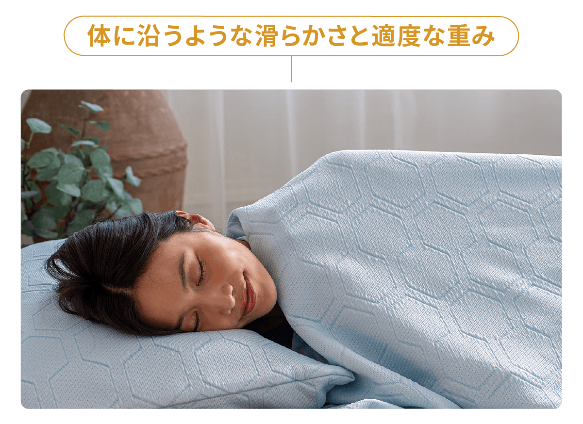 1枚のブランケットを掛けることで、汗による体のべたつき、布団内のこもるムレの不快をサポート。朝まで快適な眠りに寄り添います。