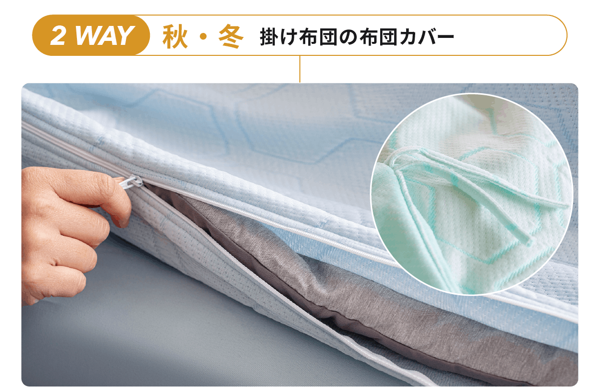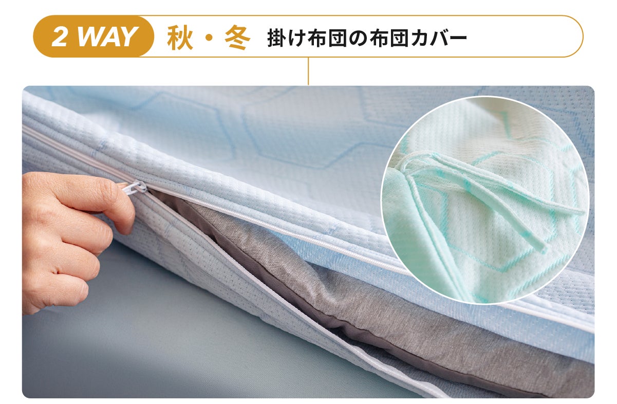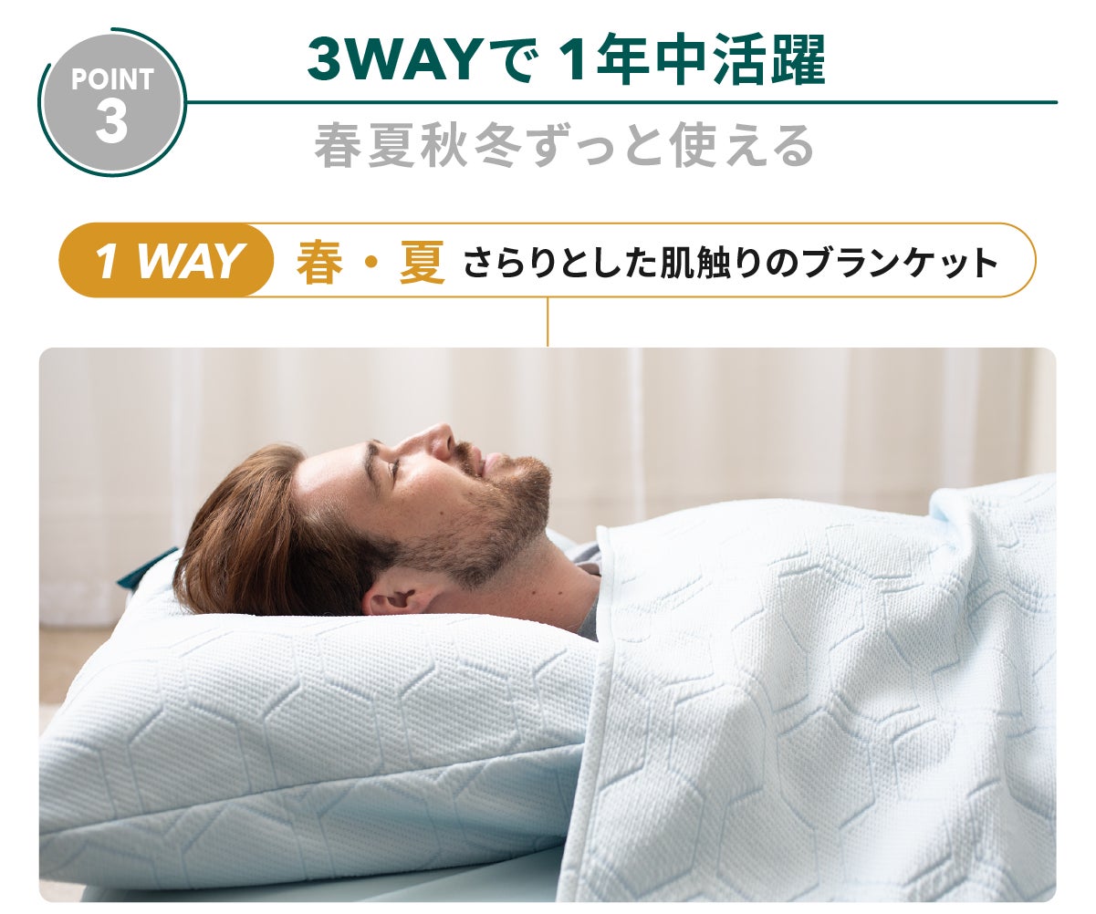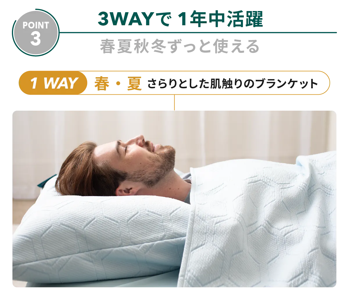 HILU Bluvetは3WAY仕様で寝具環境や気候に合わせて自在に使える柔軟性が特長です。季節を問わず、理想的な温度と湿度を保つ睡眠環境を実現します。