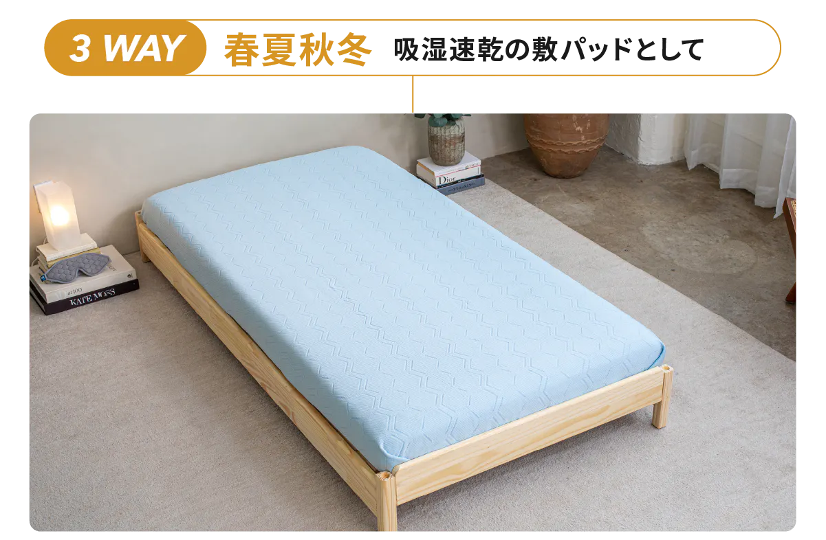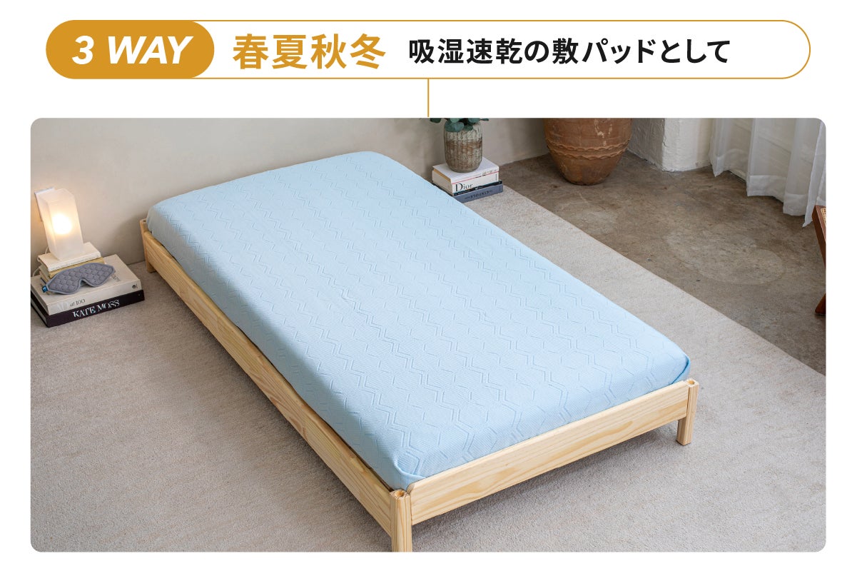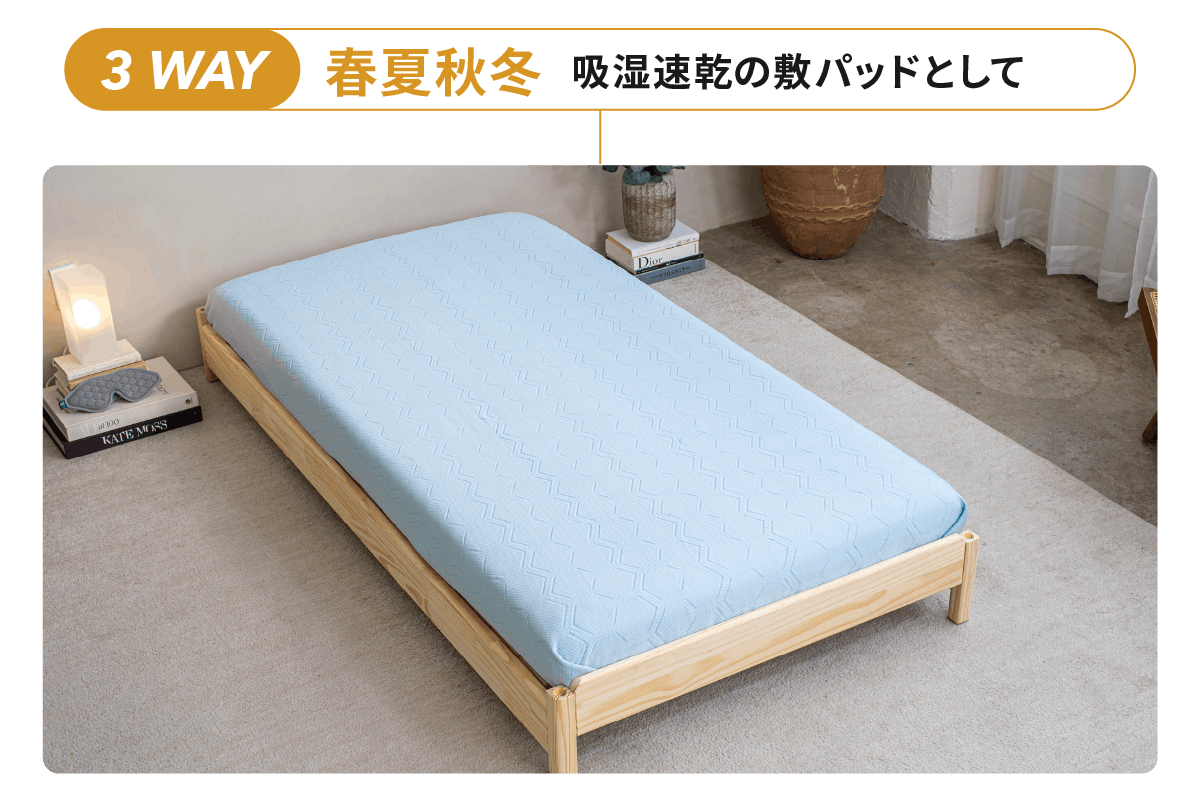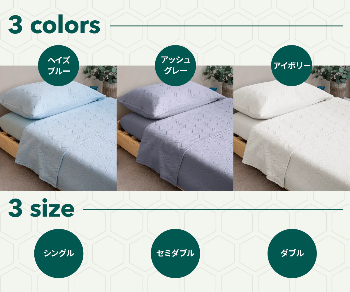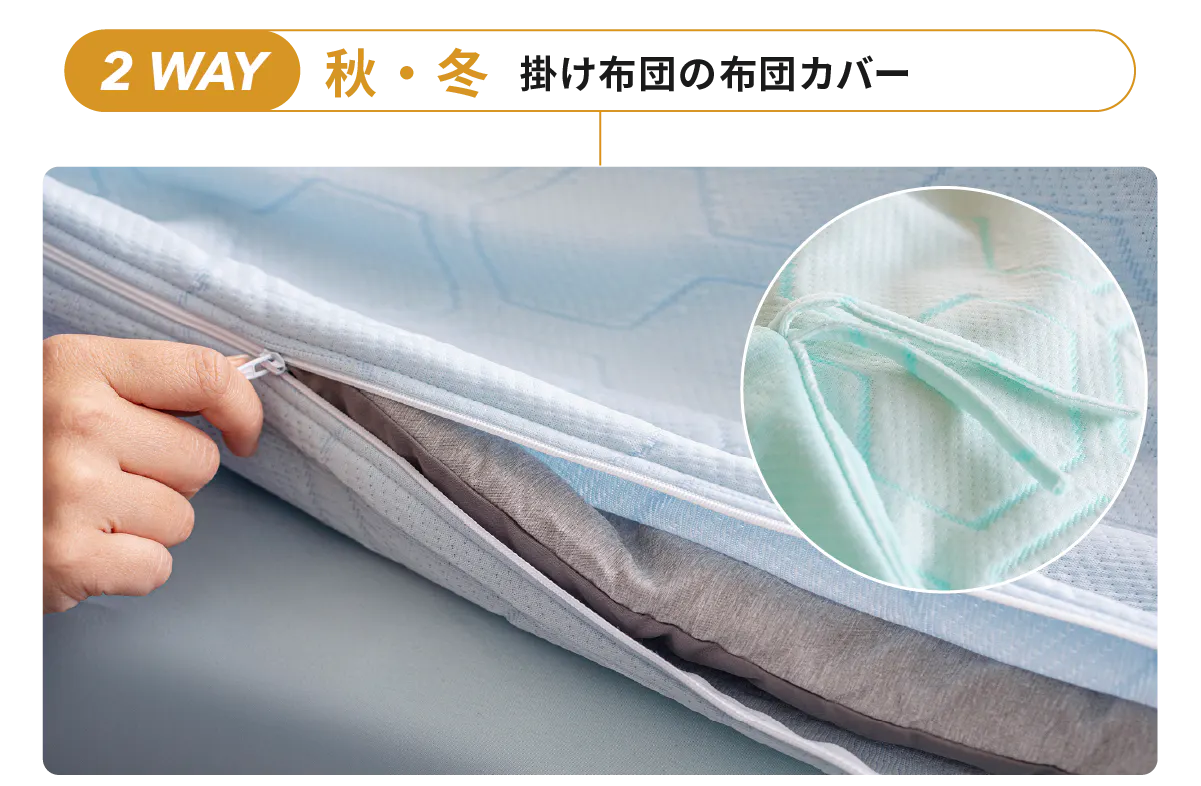 HILU Bluvetは3WAY仕様で寝具環境や気候に合わせて自在に使える柔軟性が特長です。季節を問わず、理想的な温度と湿度を保つ睡眠環境を実現します。