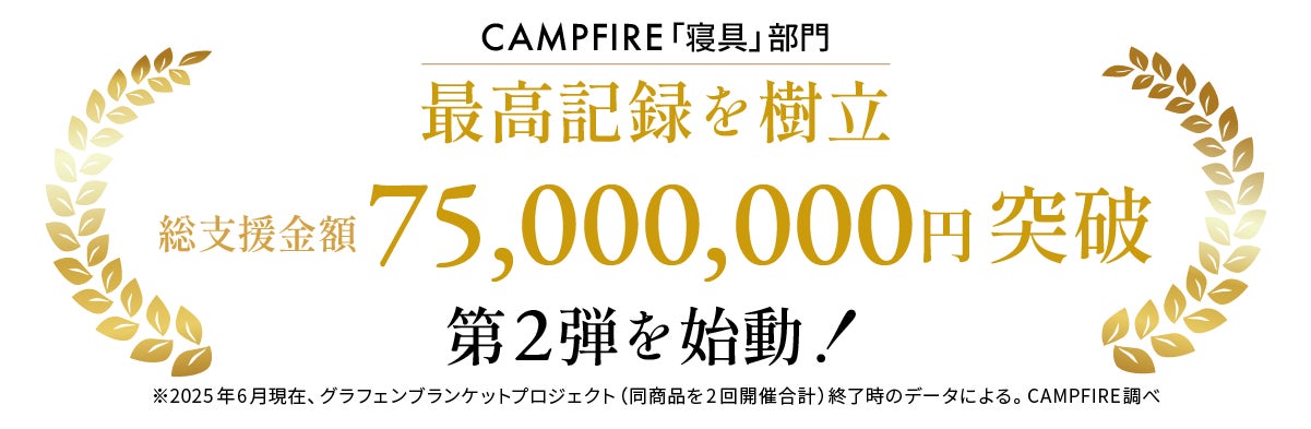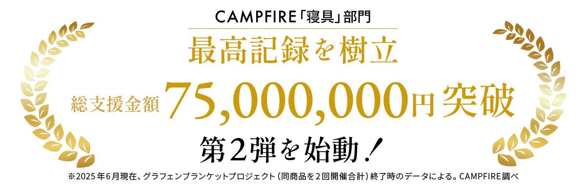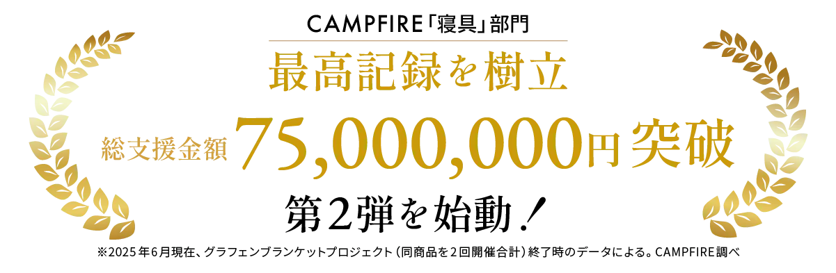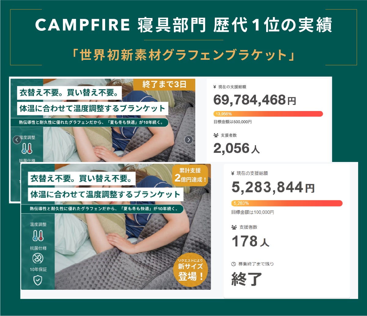 第1弾、「グラフェンブランケット」では、2,200名余り、総額7,500万円のご支援をいただきました。第2段では、睡眠中の不快に悩む日本の皆さまへ、接触冷感×調湿機能で朝までサラサラな新素材ブランケットをお届けいたします。