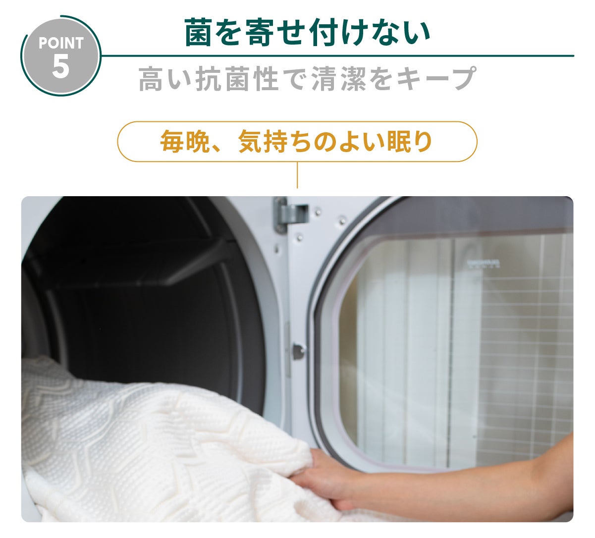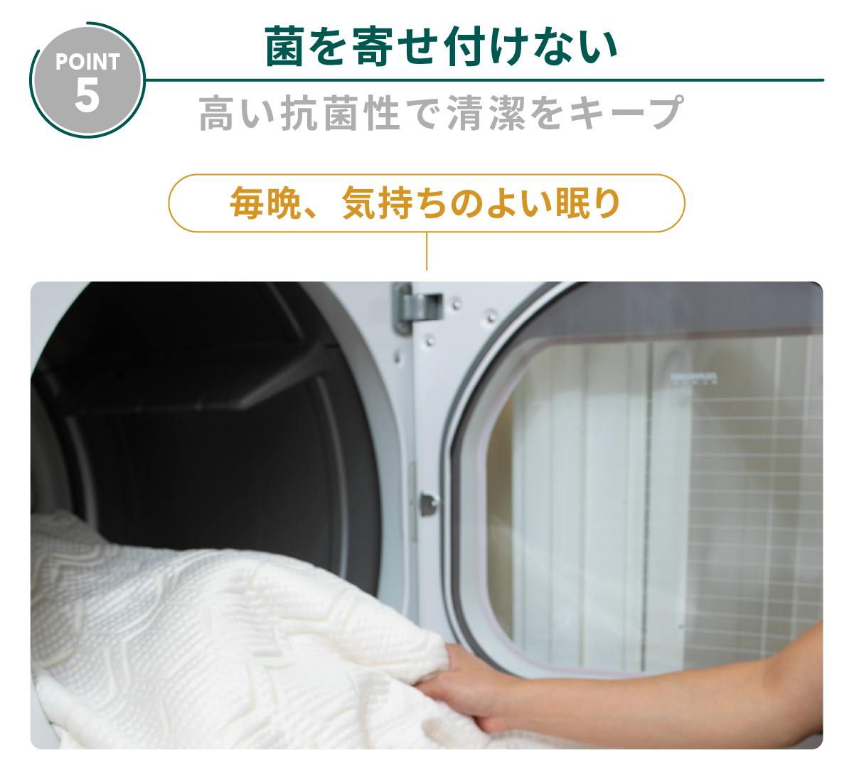 嫌なニオイや菌の繁殖を防ぎ、洗濯頻度を減らしても清潔を保ちます。抗菌性と速乾性に優れた設計により、日々のメンテナンスの手間を軽減。忙しい日常でも清潔で快適な寝具環境を維持できます。