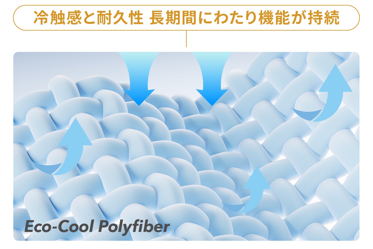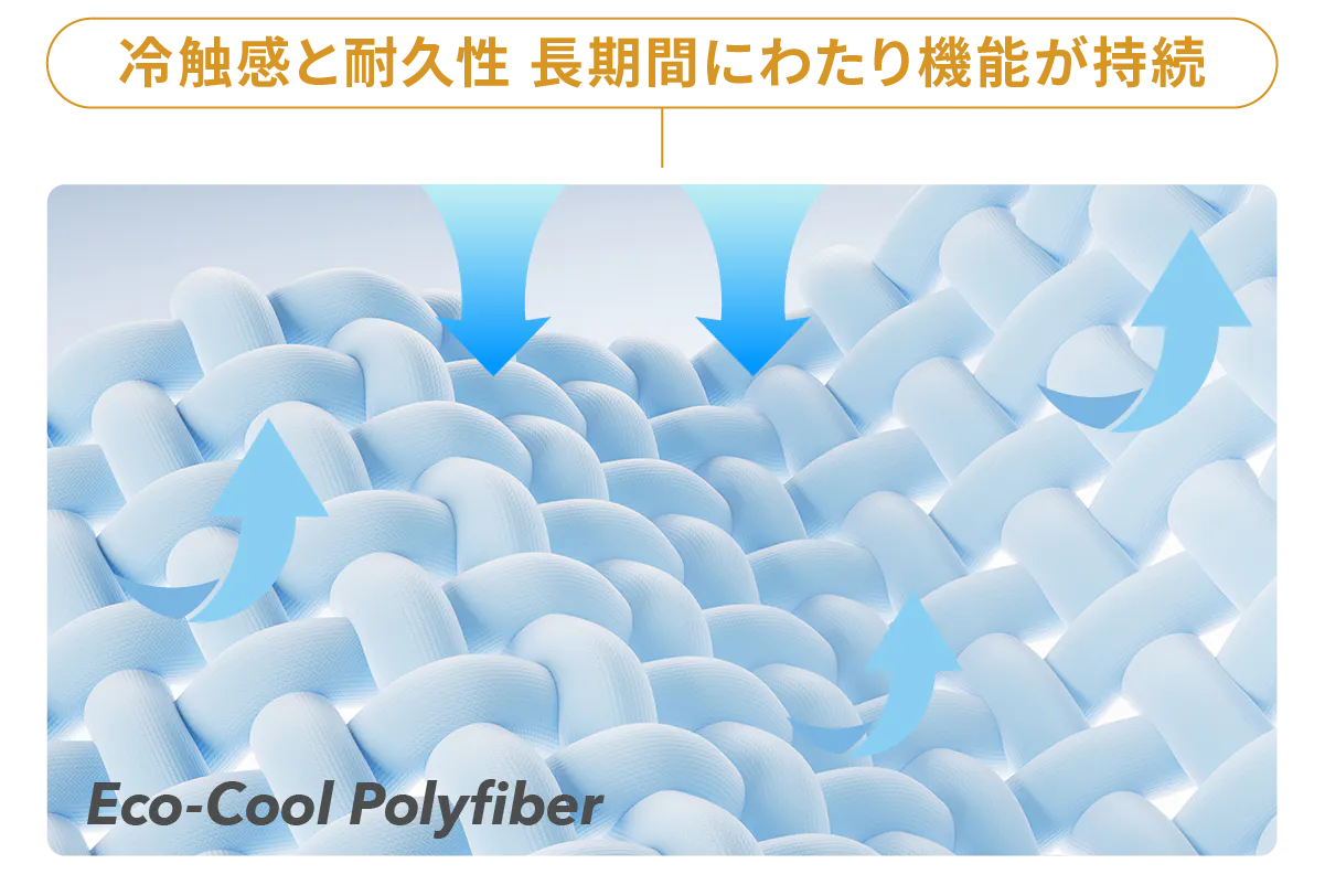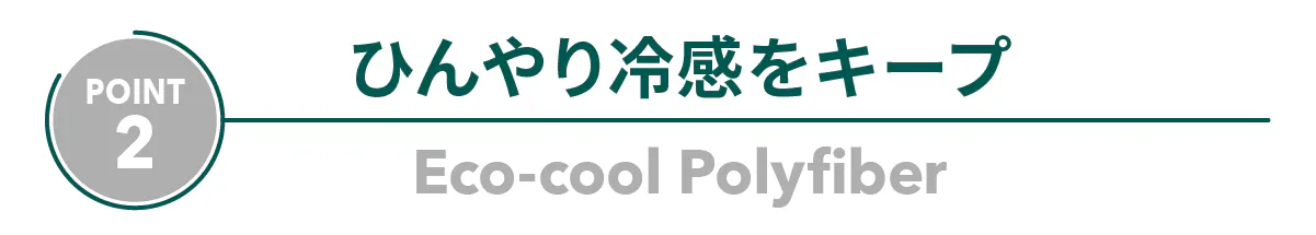 Eco-cool Polyfiberは先進的なジェル紡糸製法から生まれた素材。スポーツウエアに使われる生地と同じ製法で作られています。糸、1本1本が水を嫌う性質があります。放熱性が高く、長時間にわたって冷感を持続させる、優れた耐久性を併せ持ちます。