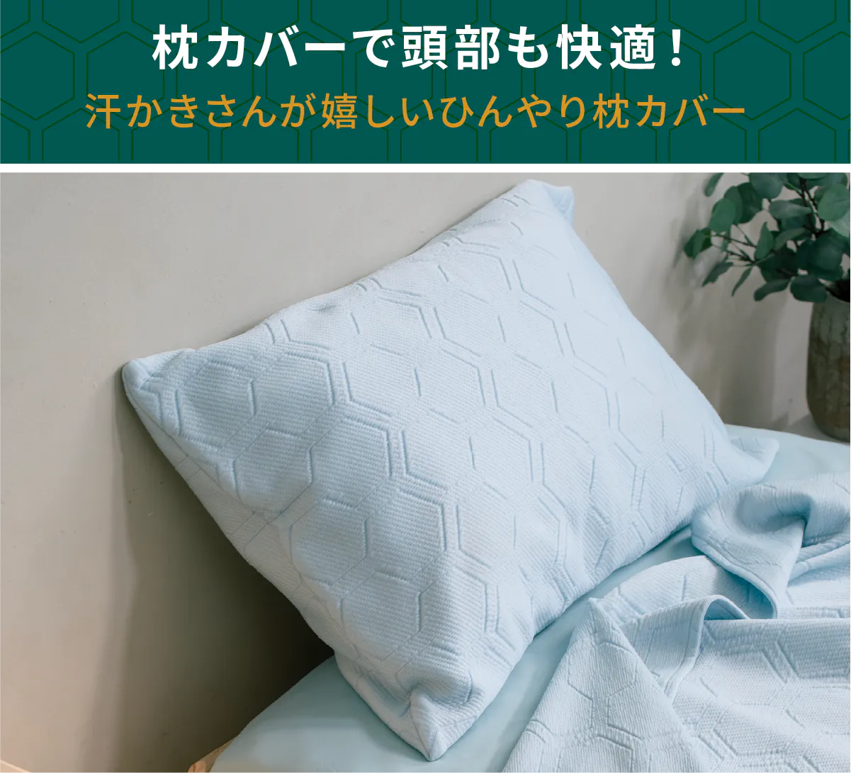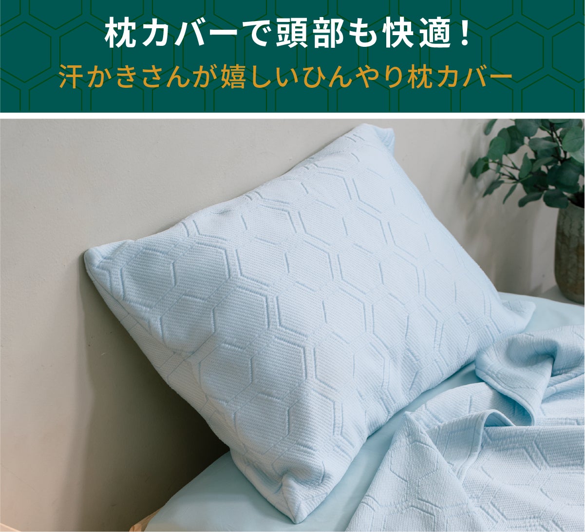 HILU Bluvetと同じ冷感素材を使用した枕カバーもご用意しました。入眠時の頭部の熱をすばやく逃がし、蒸れや寝汗による不快感を軽減します。更年期による多汗や、寝苦しい夜に悩む方にもおすすめ。頭まわりまでひんやり快適な睡眠環境をサポートします。
