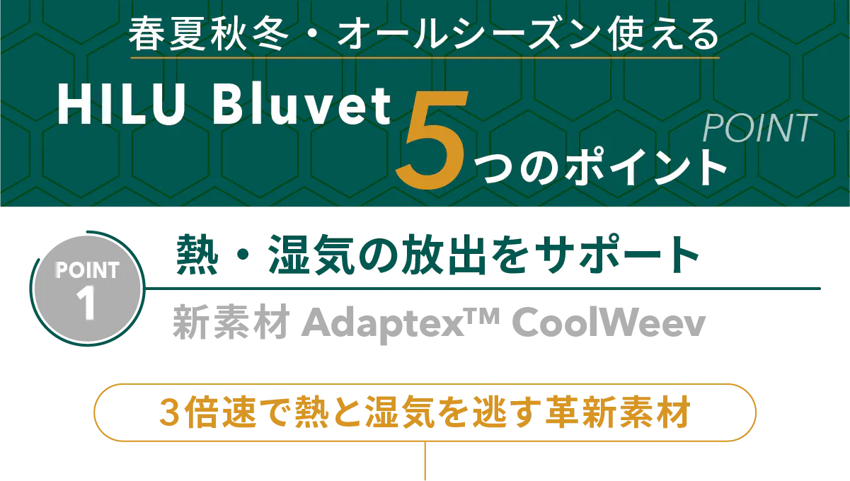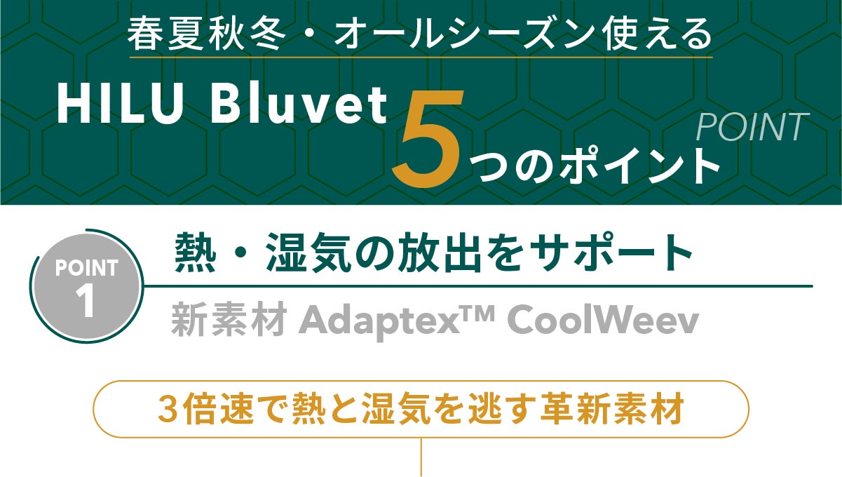 今回発表するHILU Bluvet(ヒル・ブルーベット) は独自開発・特許出願中の素材「Adaptex™ CoolWeev(アダプテックス・クールウィーブ)」を使用した、革新的なスリープテックブランケット です。