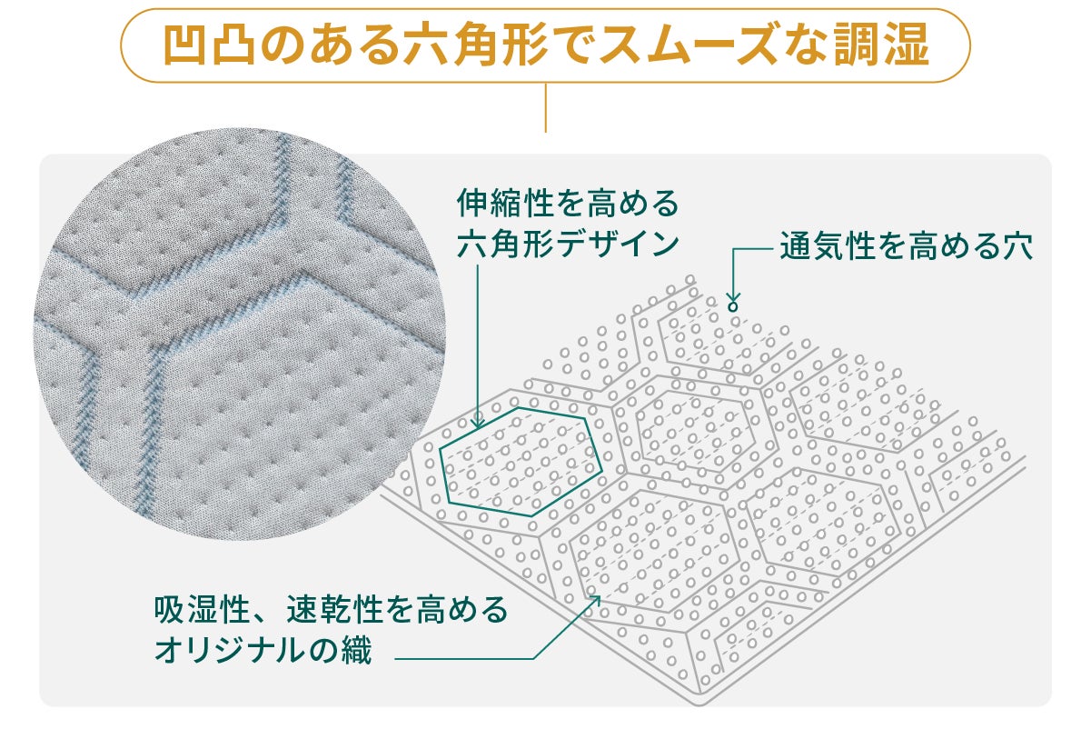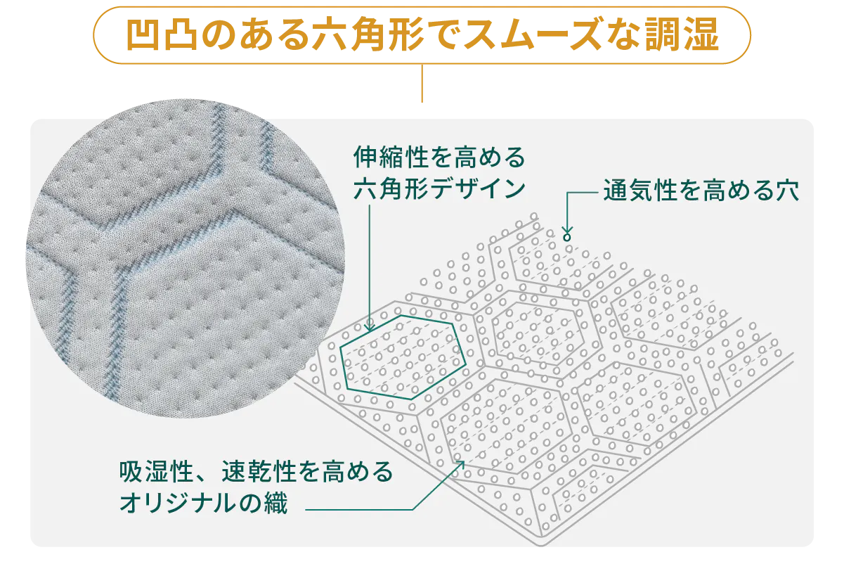 表面に設けた六角形の立体構造が、肌との間に空気の層をつくり、通気性と放熱効果をアップ。この6六角形が寝返りに沿って伸びることで快適な寝心地が朝まで続きます。