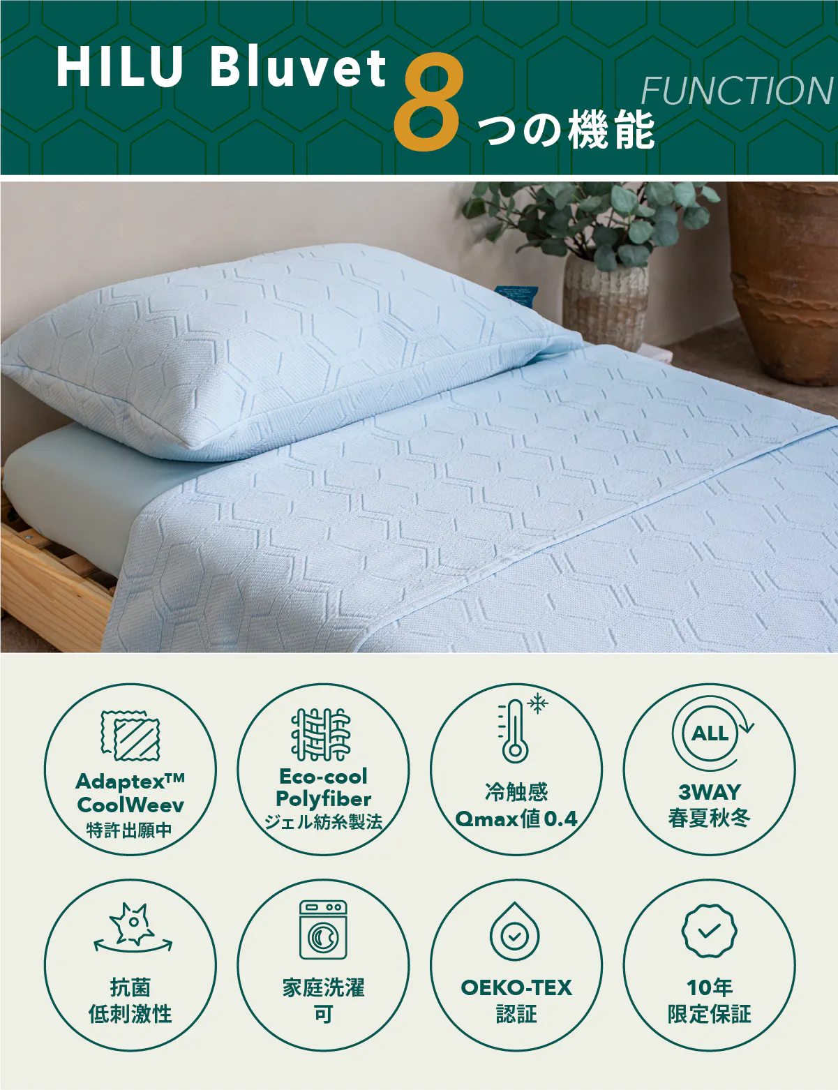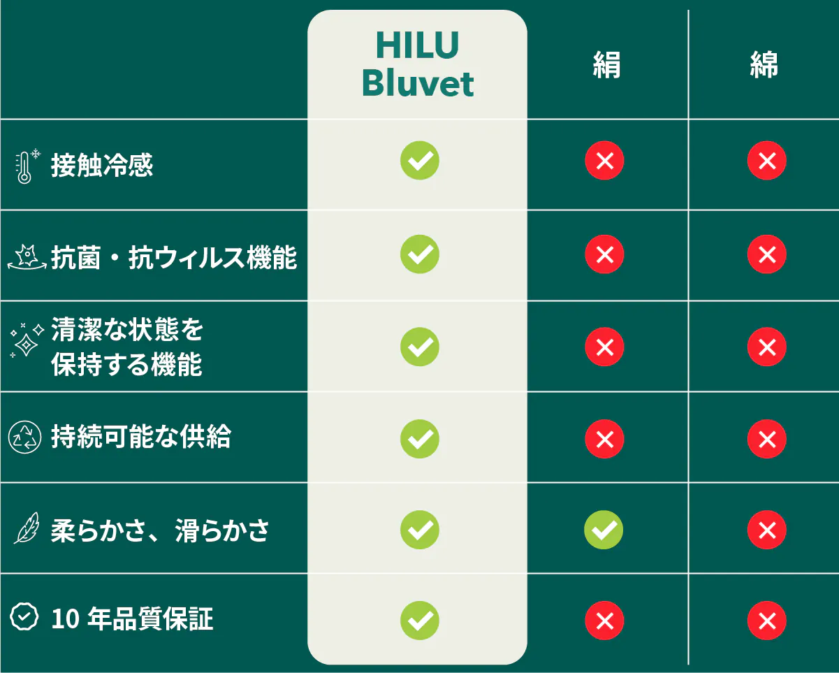 HILU Bluvetには、10年間の品質保証がついています。毎晩使うものだからこそ、長く安心して使っていただきたい。10年間、1日わずか8~10円のコストで「ひんやり、サラスベ感」が持続するブランケットをお使いいただけます。「快適な睡眠」を、これからの10年のスタンダードに。