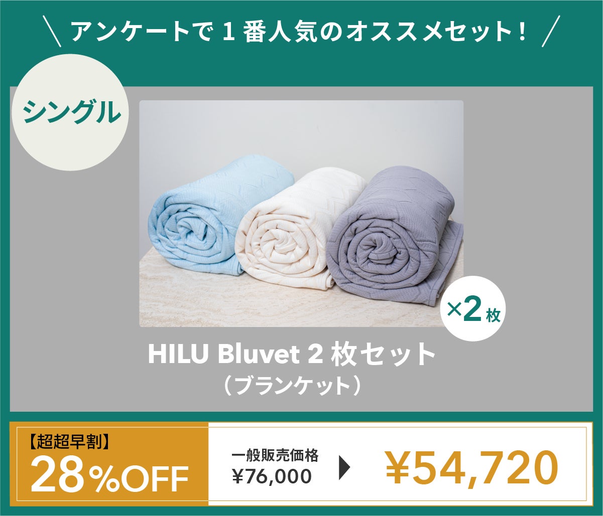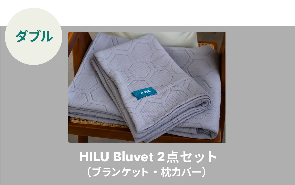 今回は特別セット「HILUオールシーズンセット」をご用意しました。グラフェンブランケットの布団カバーとしてHILU Bluvetをお使いいただけるプランです。1年中快適にお過ごしいただけます。