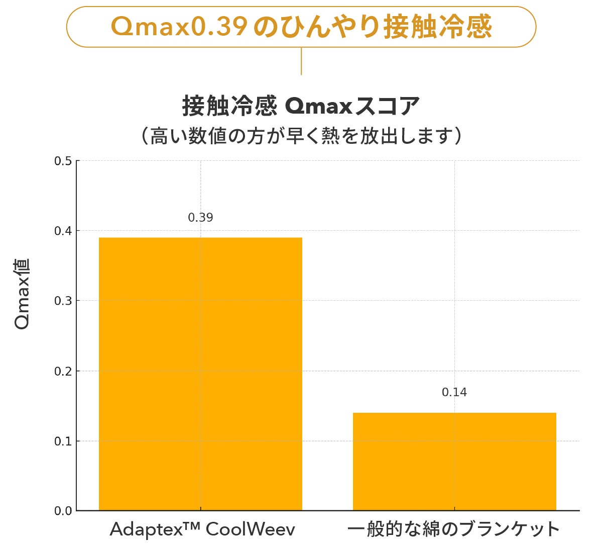 第三者機関のQmax試験において、一般的な綿素材の約0.14に対し、0.39という数値を記録。瞬時に肌の熱を吸収し、触れた瞬間からクールな感覚を実現します。