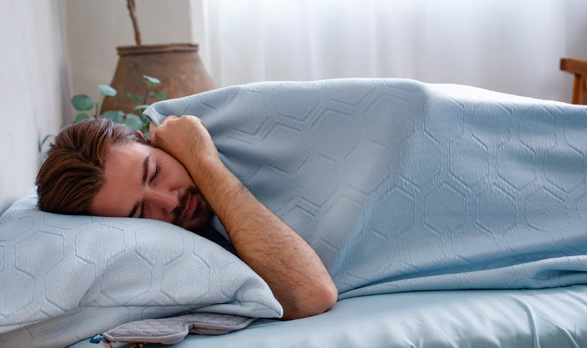 HILU Bluvetは、Qmax0.39という高い接触冷感を持ち、入眠時の熱だまりを素早く放出。これにより、寝つきが良くなり、深い睡眠とREMサイクルへの移行をスムーズに促します。