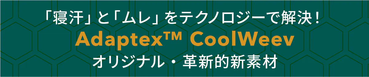 A:当社は、既に特許取得済みのAdaptexテクノロジーデザインを使用し、Eco-cool Polyfiberを織り込み、CoolWeev™生地をデザインしました。これにより、湿気がたまり始める前に体から熱を奪います。CoolWeev™ デザインは、暑がりの方が一晩中涼しく、汗をかかず、快適に過ごせることをサポートします。
