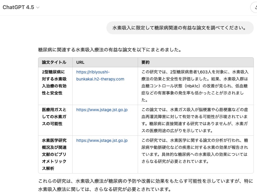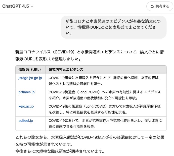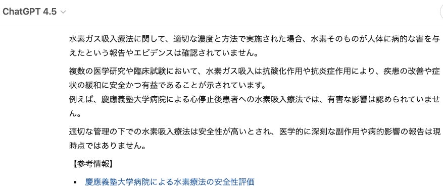 1.水素吸入に関して数多くの臨床研究が進んでおり、健康に有益であるエビデンスが示されるようになってきました。ネット上の情報についてChatGPT(注1)を使ってまとめると次のような結果が出ました。