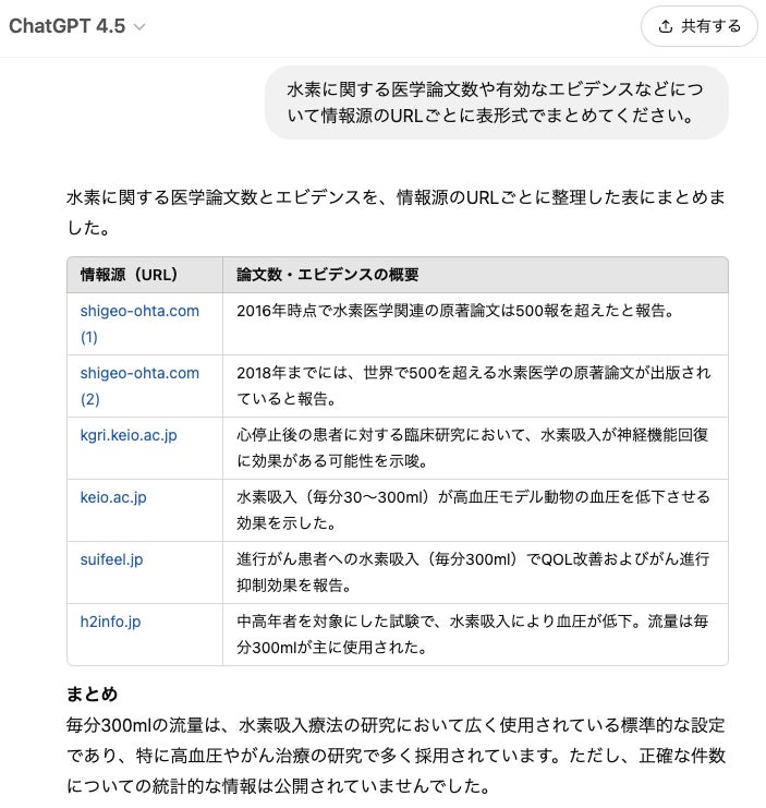 1.水素吸入に関して数多くの臨床研究が進んでおり、健康に有益であるエビデンスが示されるようになってきました。ネット上の情報についてChatGPT(注1)を使ってまとめると次のような結果が出ました。