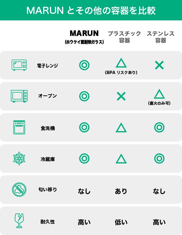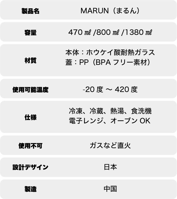 「MARUN」の容器はBPAフリーで安心して使用できます。定期的に容器の状態を確認し、破損が見られた場合は使用を中止してください。また、清潔に保つことが大切です。