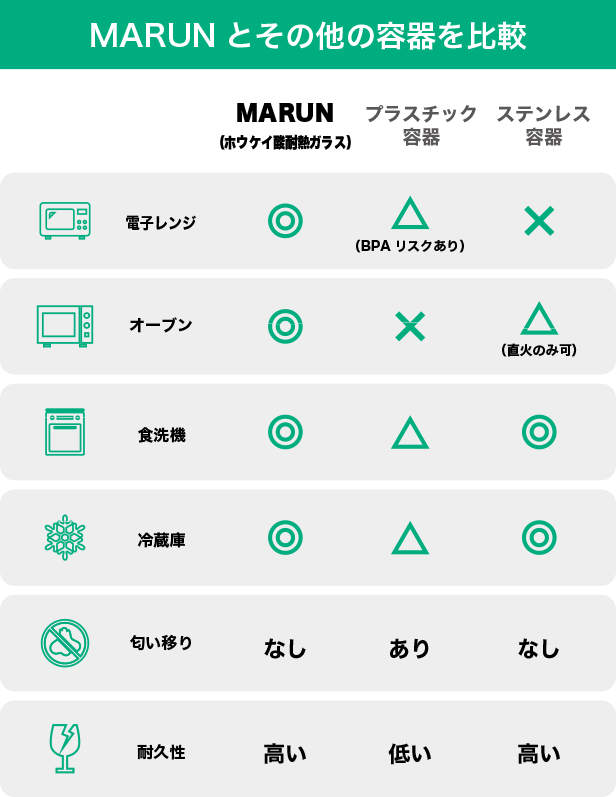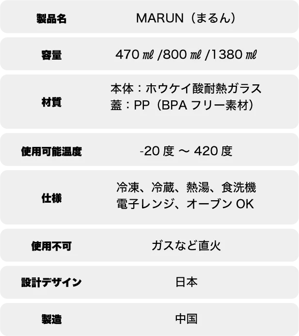 「MARUN」の容器はBPAフリーで安心して使用できます。定期的に容器の状態を確認し、破損が見られた場合は使用を中止してください。また、清潔に保つことが大切です。