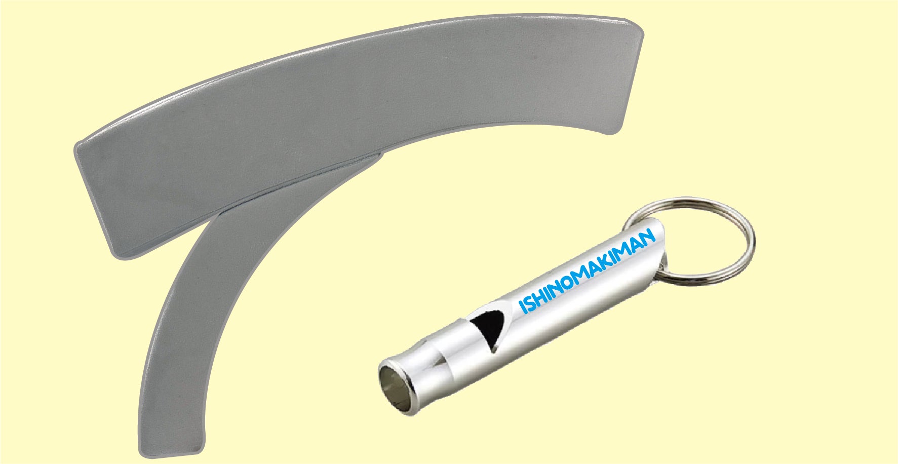 がれきの下に閉じ込められた時などに助けを呼ぶため、「イシノマキマン」の頭部のブーメランの中に小さな防災ホイッスルを内蔵します。