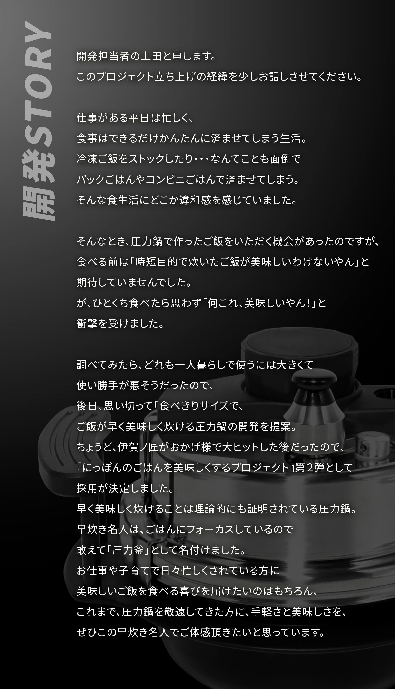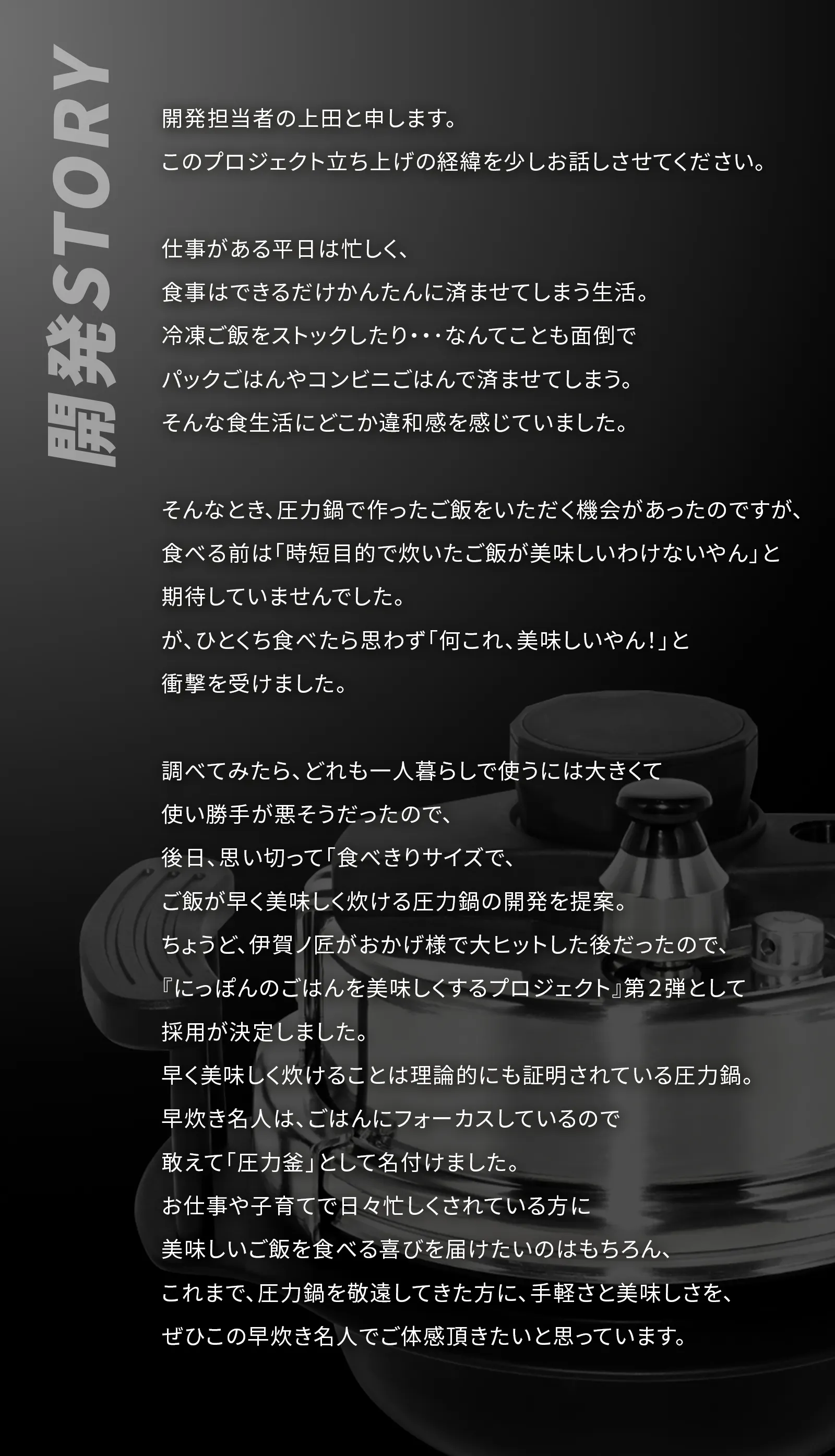 私たち「プライムダイレクト」は、お客様の「楽しく、健康に生きる」を応援するため、自社で商品を開発しテレビやWEBなど様々なメディアを通じて、日本中にたくさんの商品をご紹介して参りました。今回の「圧力釜」もまた皆様の暮らしを彩り、より豊かにすることを目指しプロジェクトに努めて参りますので、ご支援のほど何卒よろしくお願いいたします!