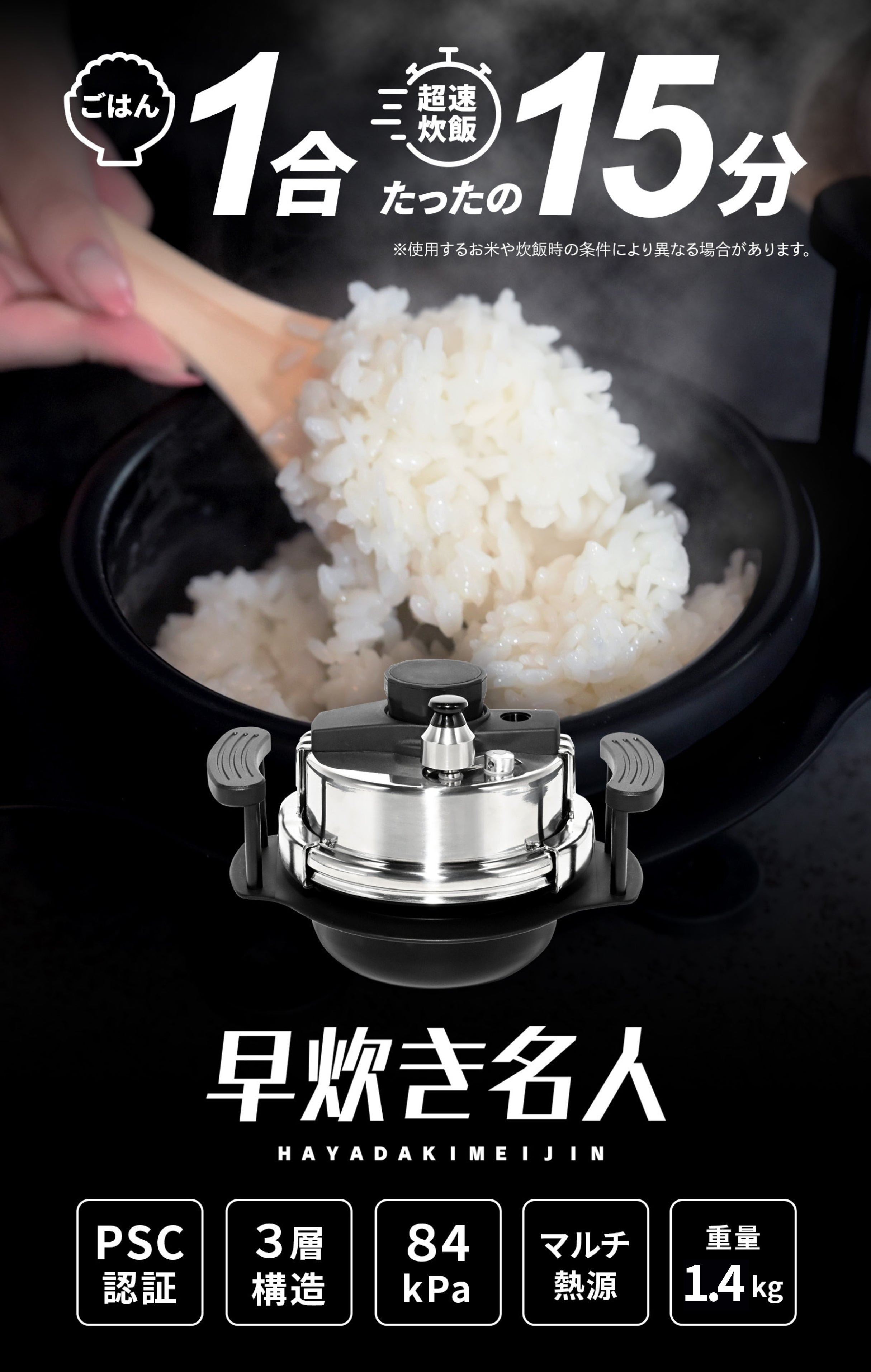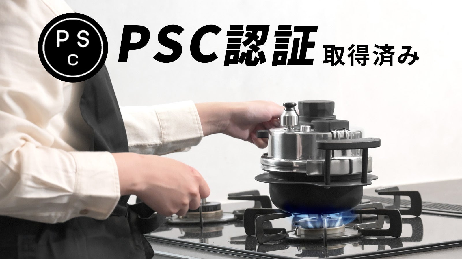 「家庭用の圧力なべ及び圧力がま」は、消費生活用製品安全法の特定製品(注1)になっています。販売時には国が定める「PSCマーク」を表示することが義務づけられています。早炊き名人はもちろん取得済みなので安心してお使い頂けます。